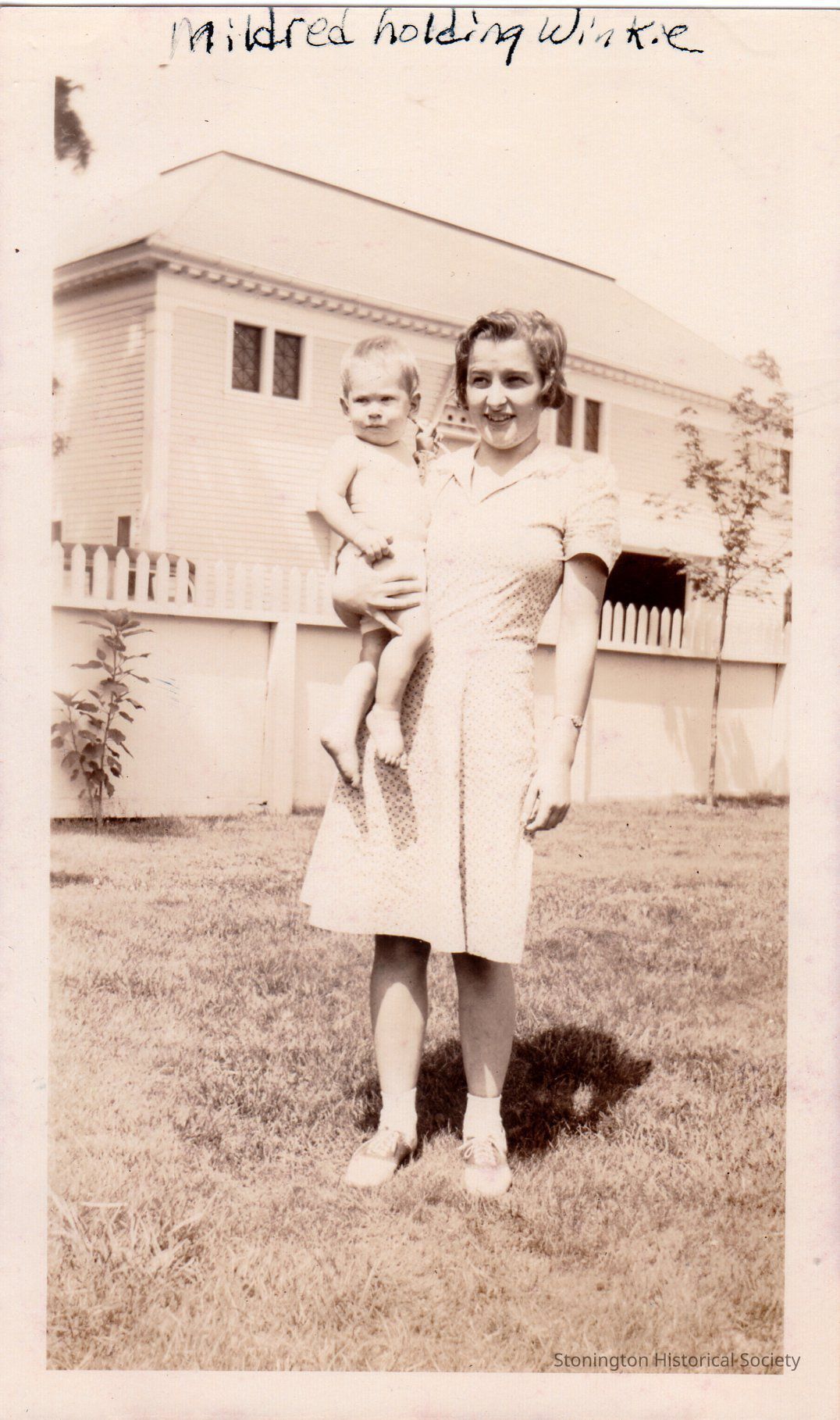 black and white snapshot, Mildred holding Winky Paffard at Stone Acres, c. 1941.