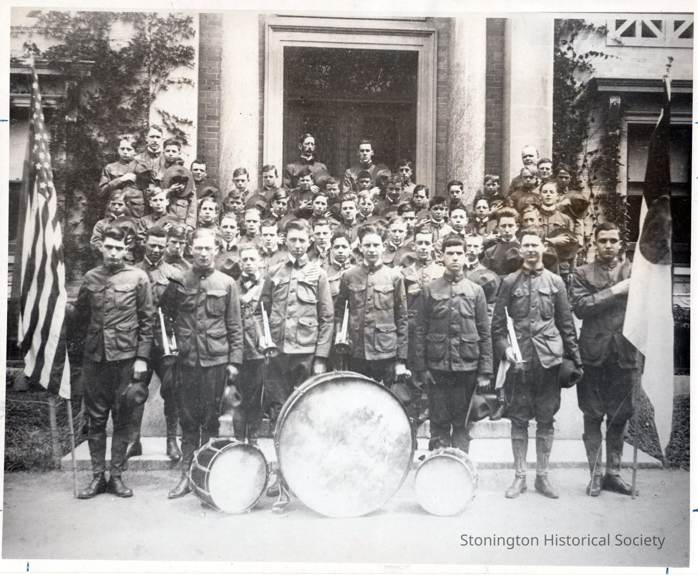 Black and white photograph of "Pioneer Boy Scout Troop" taken in front of the Stonington Free Library