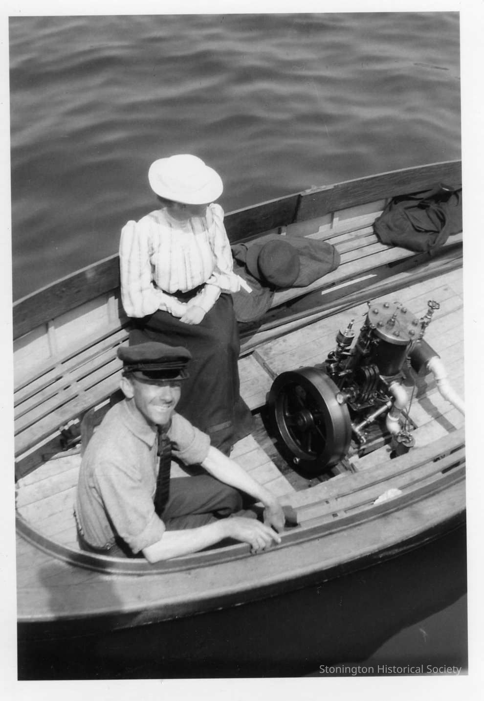 Photograph of Doug Anderson (?) smiling at the photographer in his boat "Sliver." There is an unidentified woman sitting in a white hat, possibly his sister-in-law, Nell, Carl's wife.