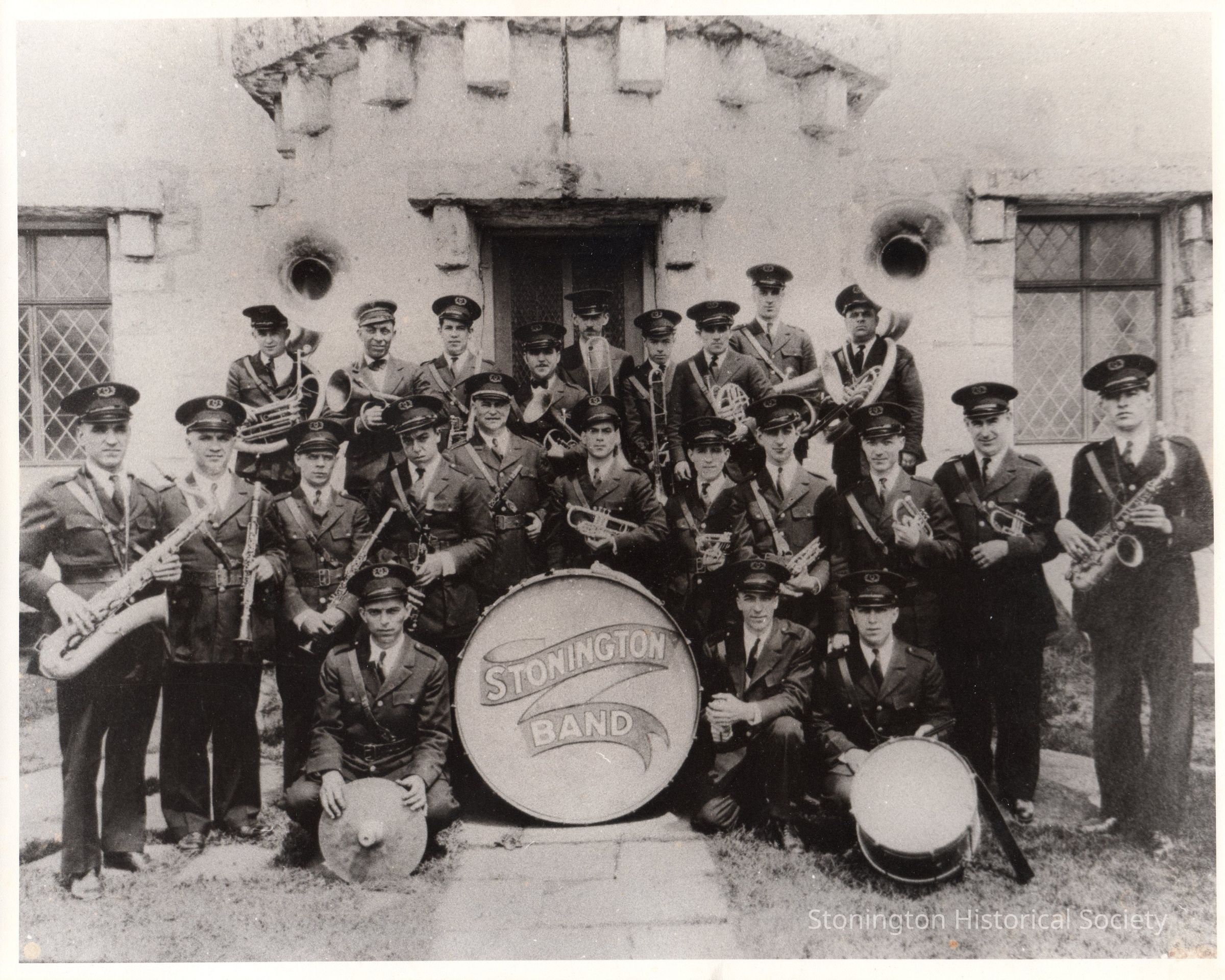 Black and white photograph of the Stonington Band posed in front of the Stonington Lighthouse.