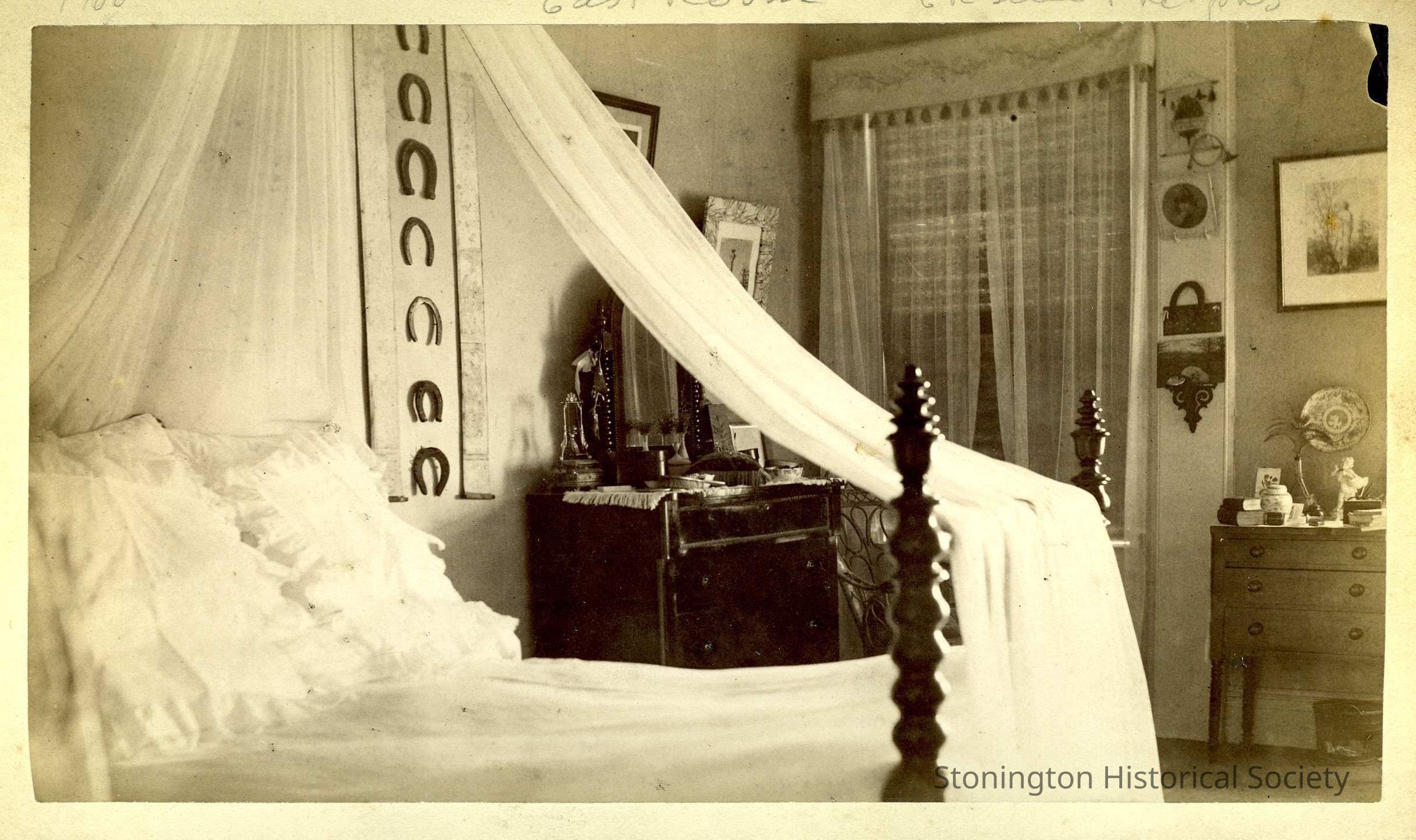 An interior photograph of one of the upstairs bedrooms at Stone Acres. The top of the photograph reads "East Room - Erskine Phelps". The photograph shows a large bed, horseshoes adorning the wall. Back of the item reads "East Bedroom before plumbing? no sink where bureau is."Collection