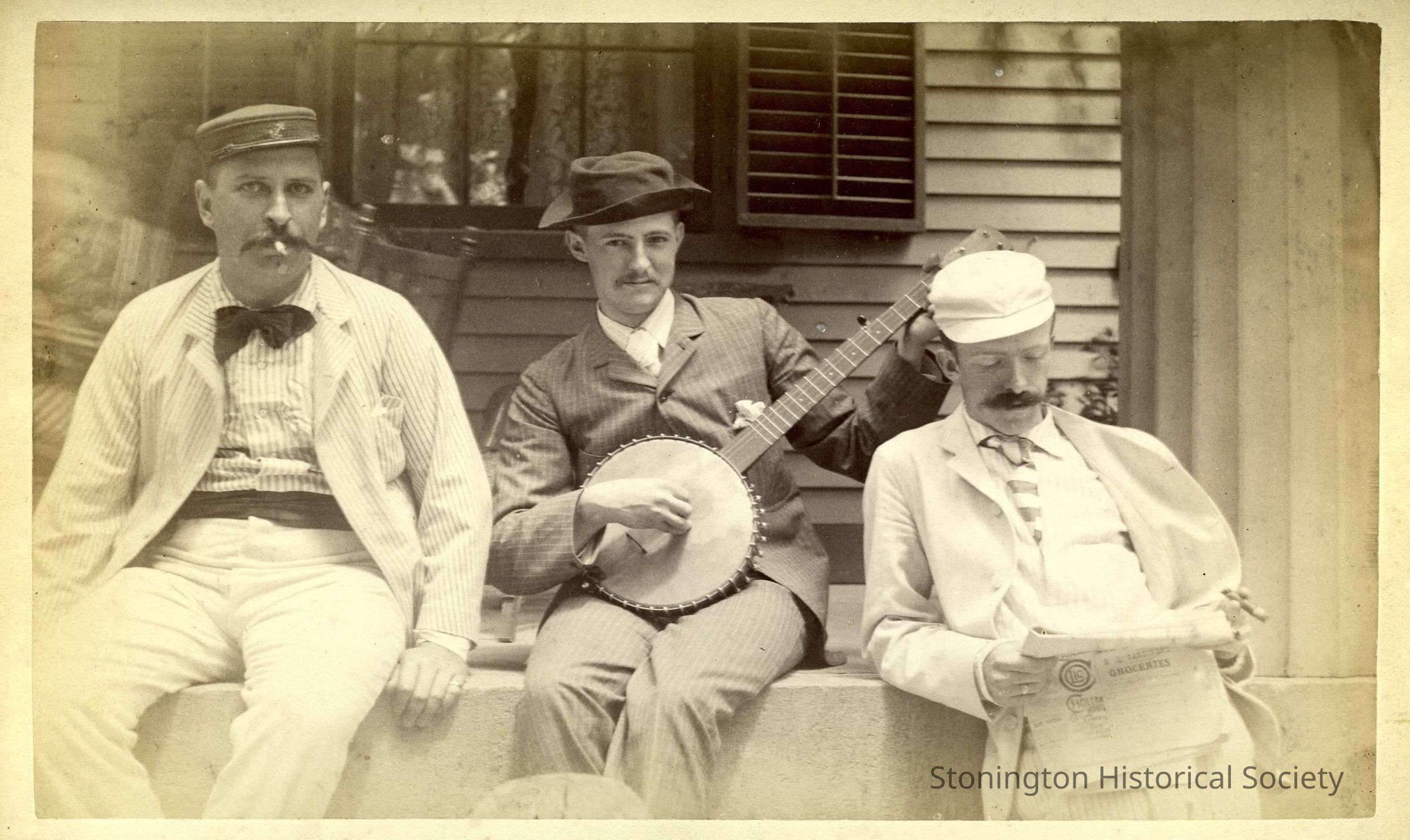 A photograph of three men standing in front of Stone Acres. The man on the far right could be Eugene Phelps Edwards, but it is unclear. The other men are not identified. The man on the left appears in other photographs and was most likely a close friend of the Edwards family.Collection