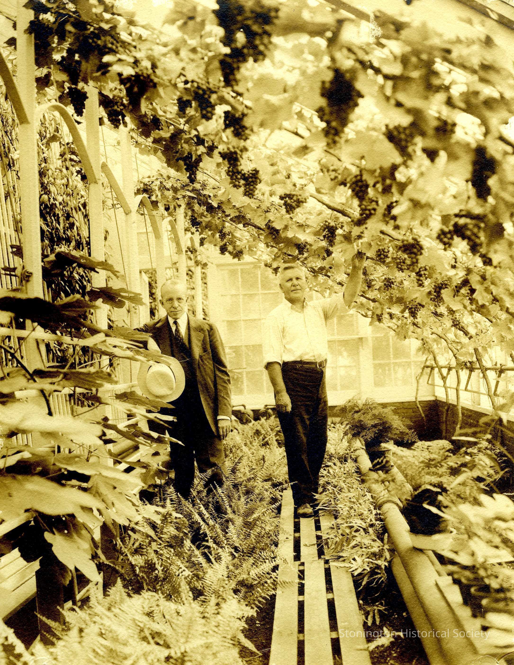 A photograph of Walter Anderson, the gardner, and Eugene Phelps Edwards in the grapery at Stone Acres. Walter is standing on the wooden planking and Mr. Edwards is standing in the ferns to his left. Above them, grape bunches are hanging from the ceiling.Collection