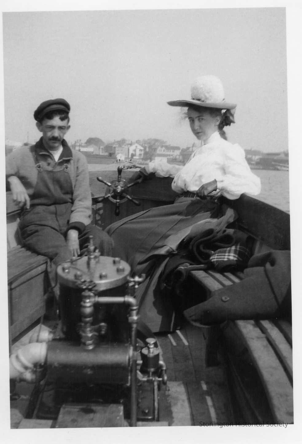 Doug Anderson and his sister Emma in his boat "Sliver" in Stonington harbor. Good example of the boat's interior and engine. Stonington is visible in the background.