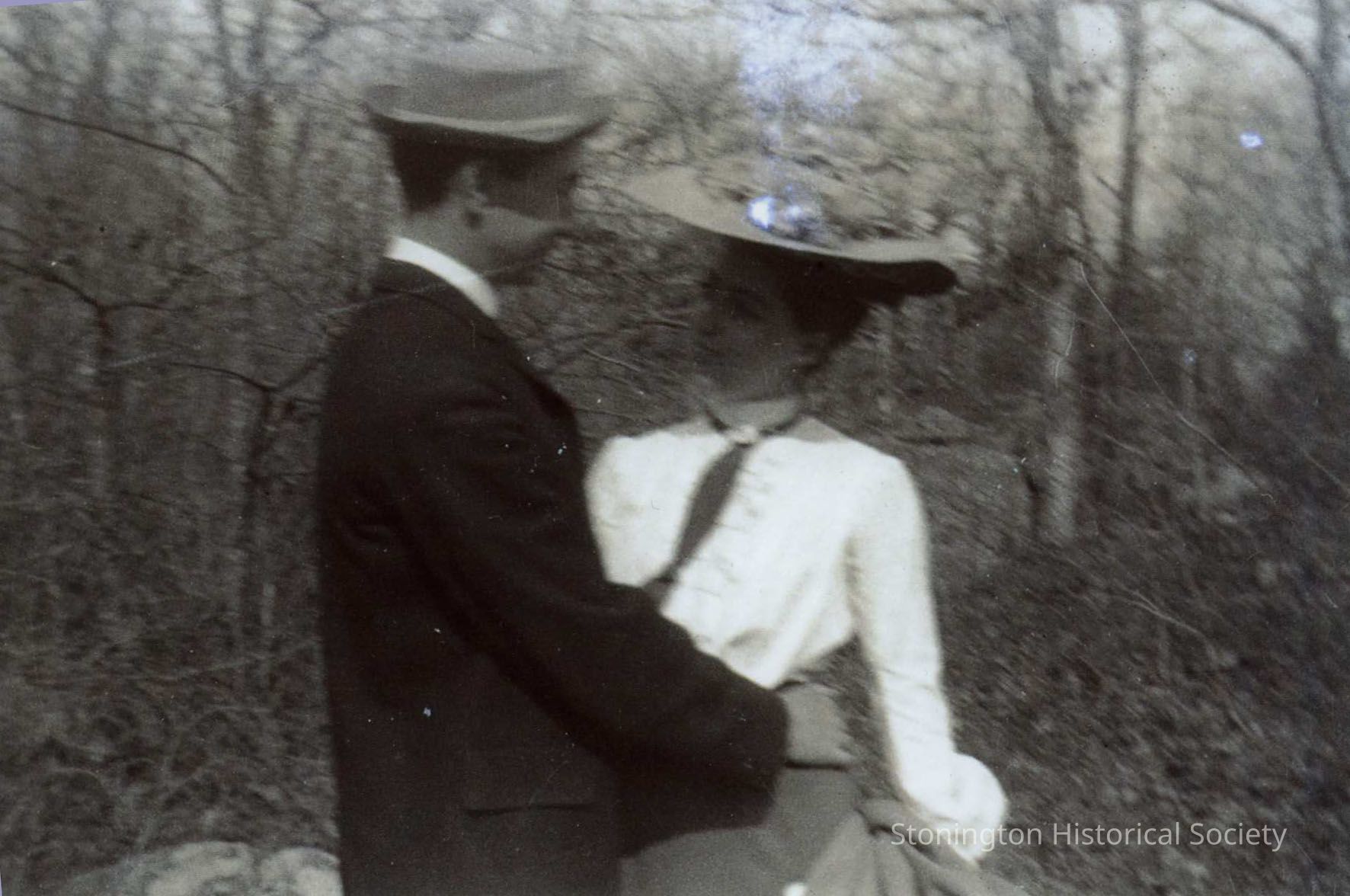Photograph of Arthur Pickett Anderson holding his wife Jessie Ashby Anderson around the waist. She is wearing a hat with flowers in it.
