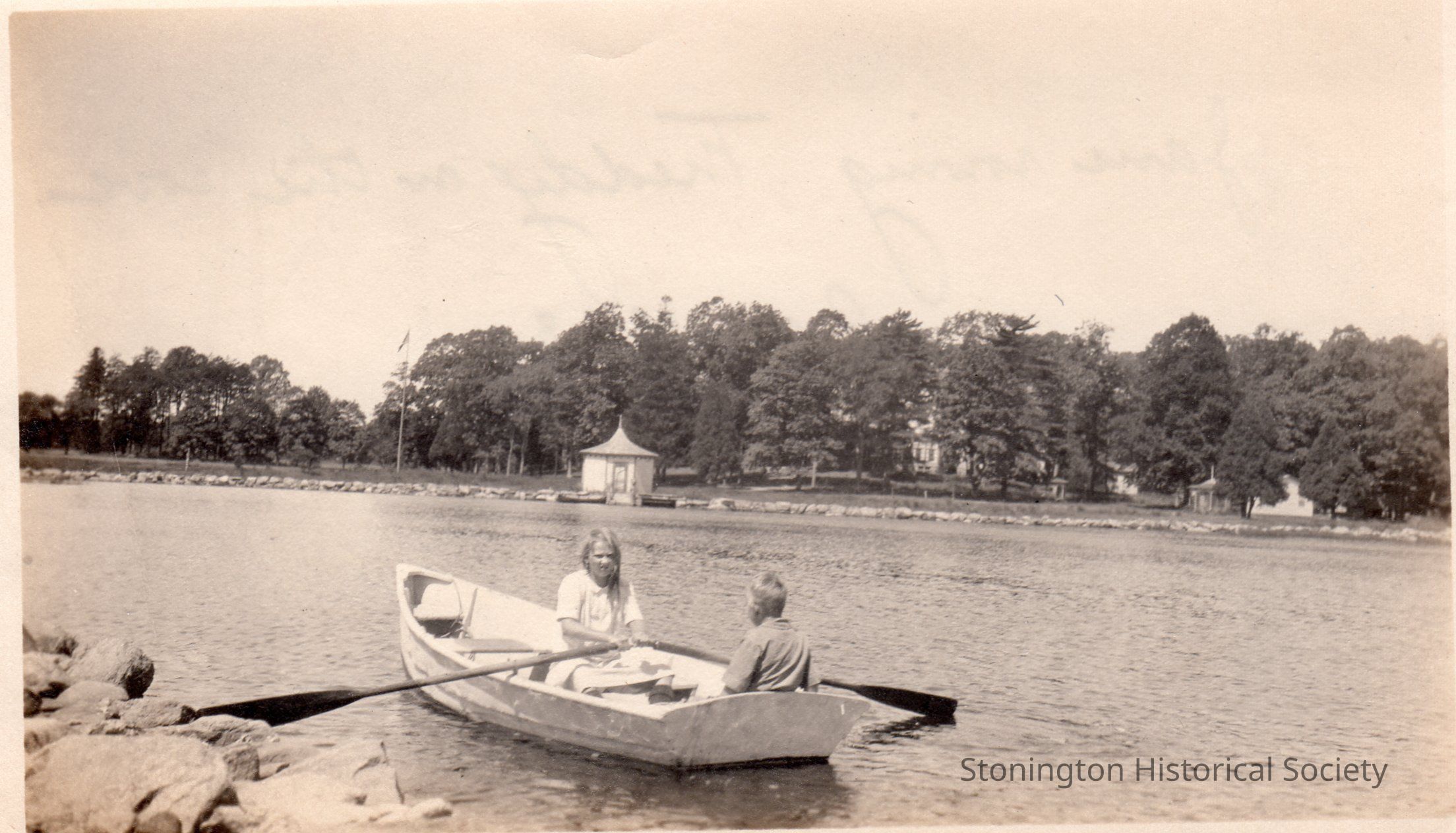 black and white photograph, Frederic Jr. "Freddy" and Jane Paffard in a rowboat on Quanaduck Cove, August 1923