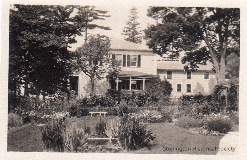 black and white snapshot of Stone Acres home (east side) and gardens, c. 1925