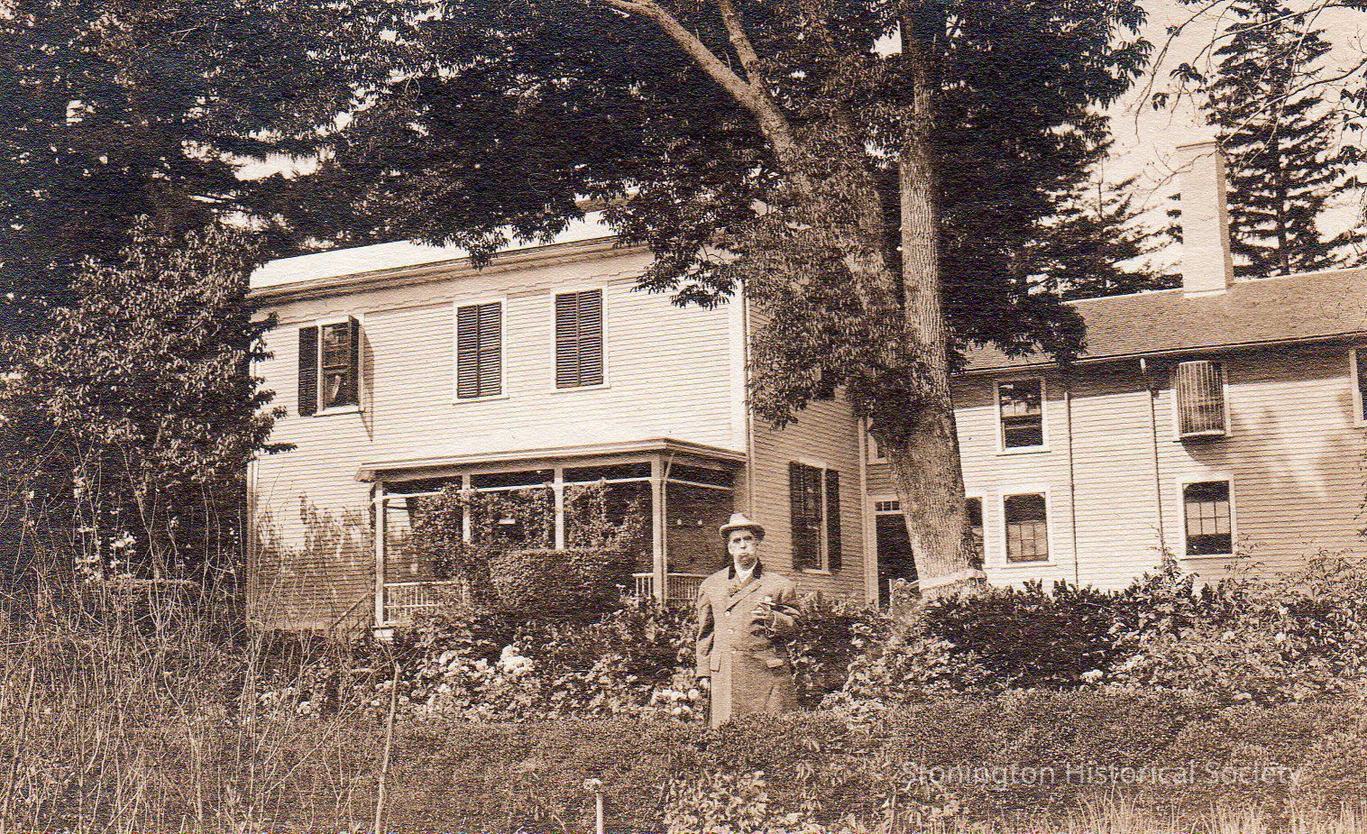 black and white photograph of Erskine Mason Phelps (1839-1910), at Stone Acres, standing in the flower garden in front of the east side of the house before the proch was renovated, 1900.