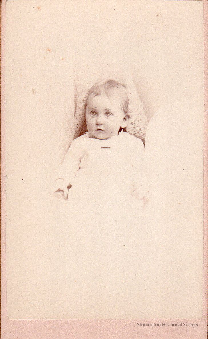 black and white portrait, mounted on board, of Helen Adams (Paffard) as an infant, taken by Metcalf & Wellson, Boston, 1880s.
