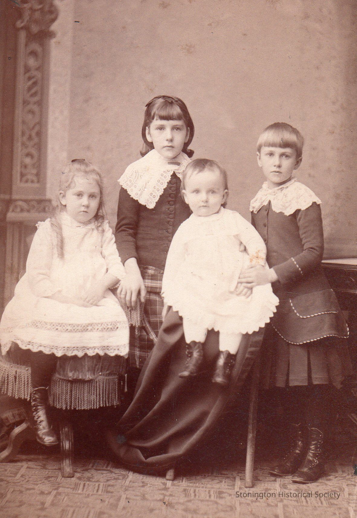 photograph portrait, mounted on board, the children of James and Emma Adams - left to right: Helen, Eliza, James Jr., and Parmelia Adams.