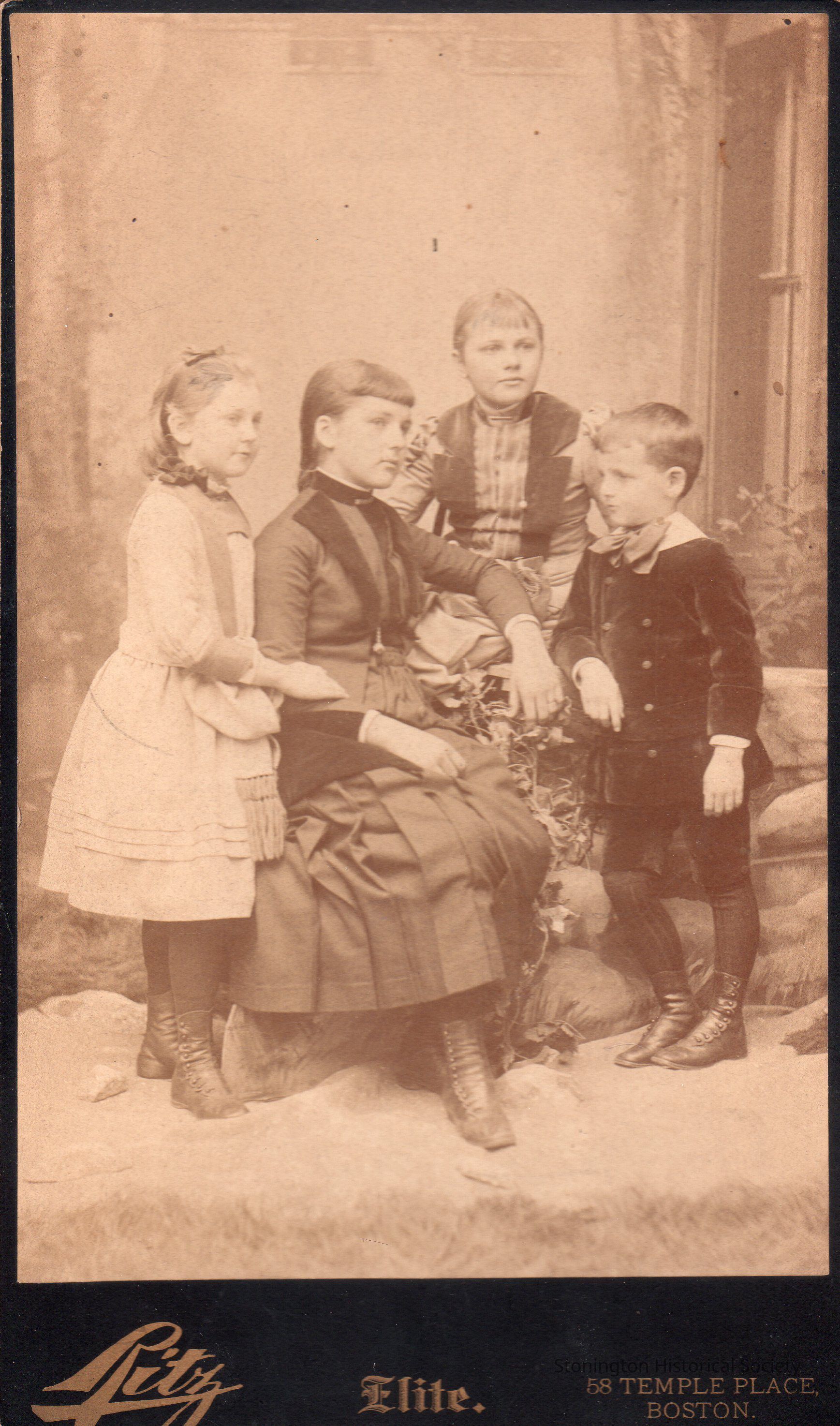 photograph portrait, mounted on board, the children of James and Emma Adams - left to right: Helen, Eliza, Parmelia and James Jr. Adams.