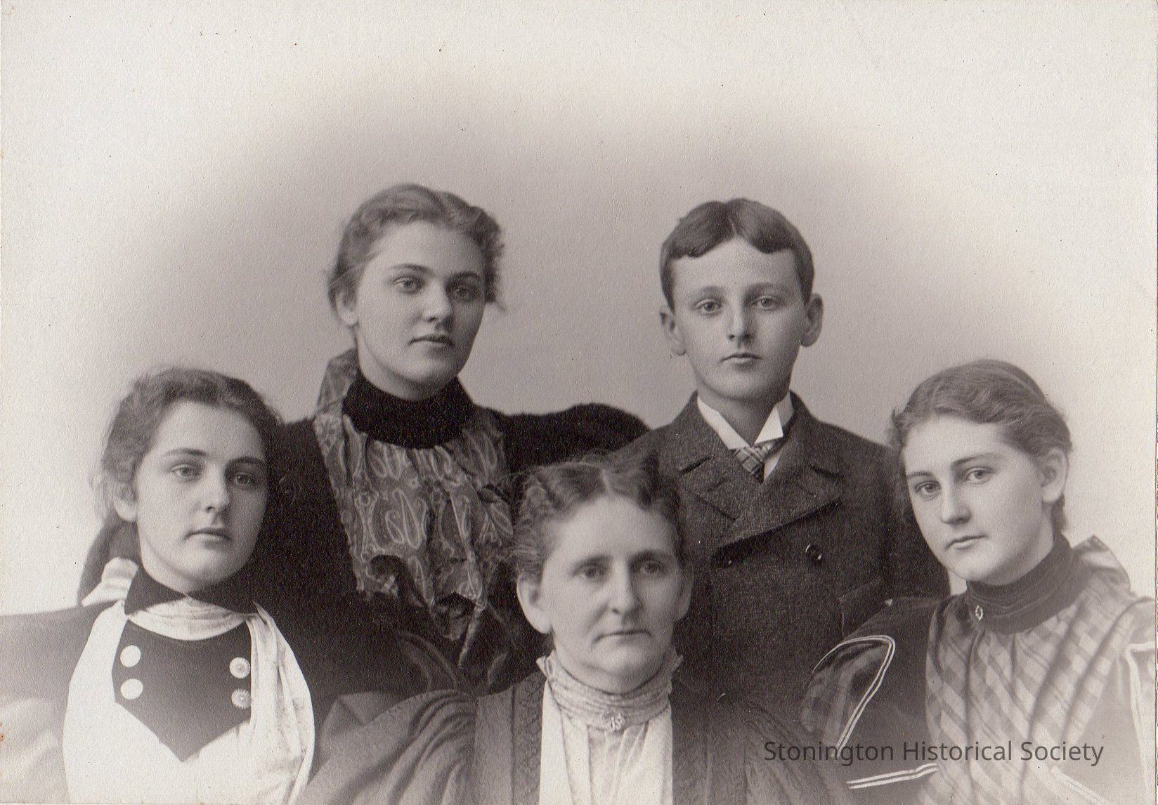 photograph portrait, mounted on board, the Adams family - left to right: Eliza, Parmelia, Emma, James Jr. and Helen Adams, December 27, 1895Collection