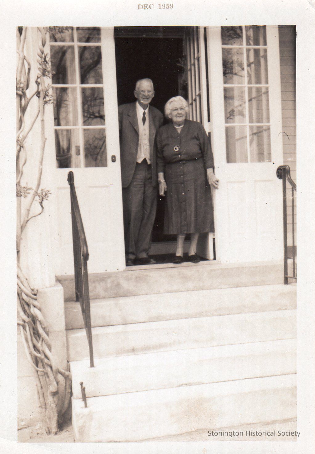 black and white photograph portrait of Helen and Frederic C. Paffard on the front porch at Stone Acres, 1959 2 copies - 4x6 and 8x10