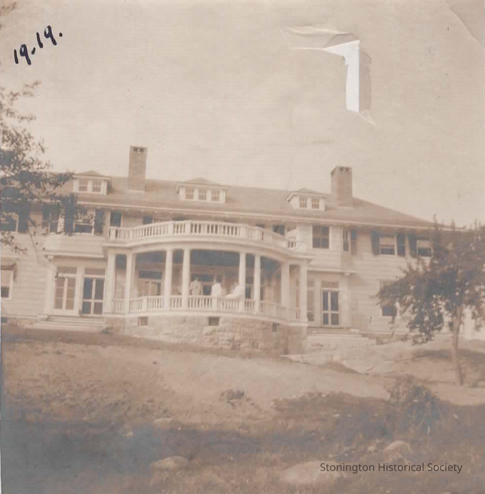 black and white photograph of the Shawondasee Estate, with three people on the front porch, 1919.