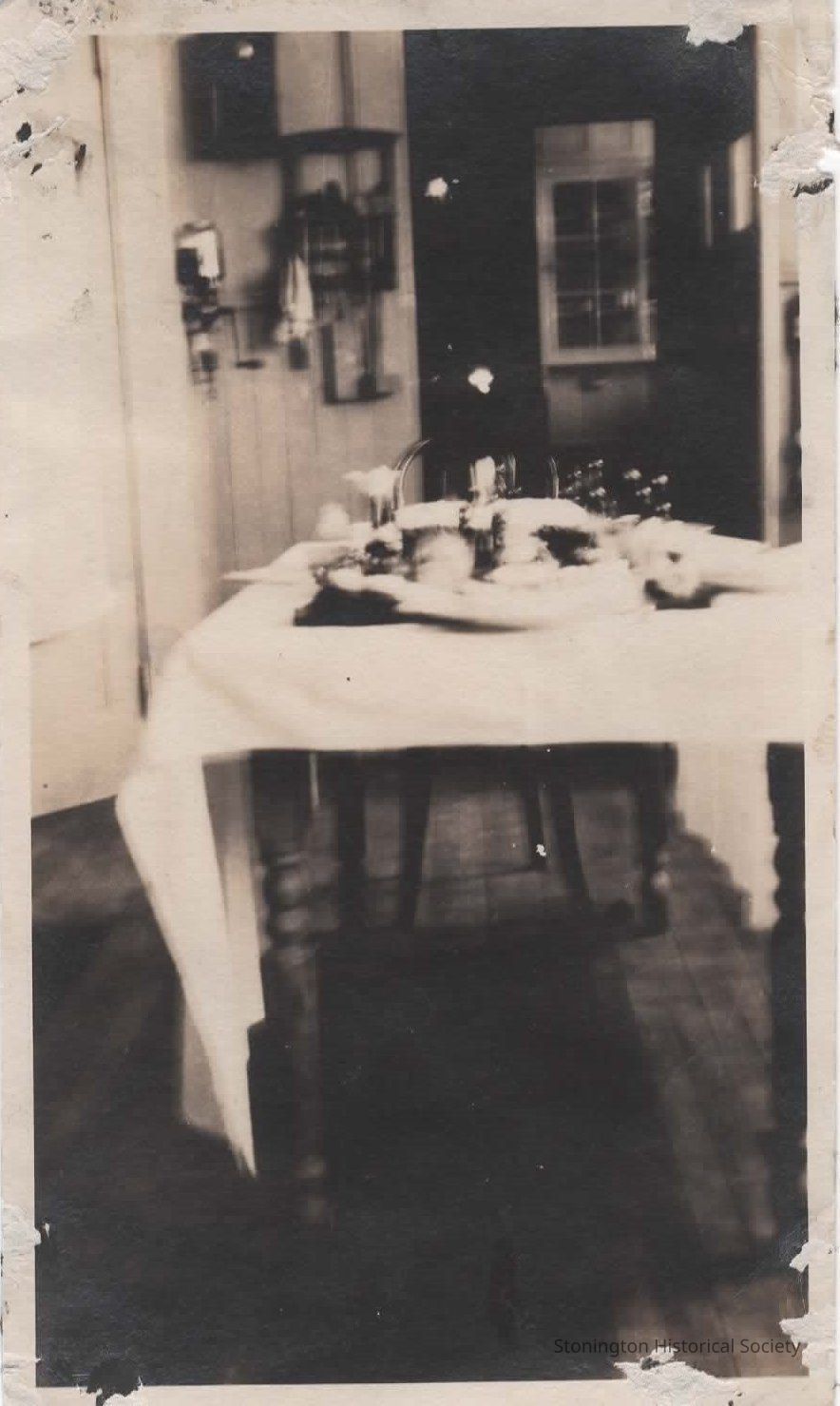 black and white photograph of the table setting for Mary Kirk's third birthday at the Shawondasee Estate, c. 1923. Mary's father, Wilson Kirk, was the caretaker for the estate.