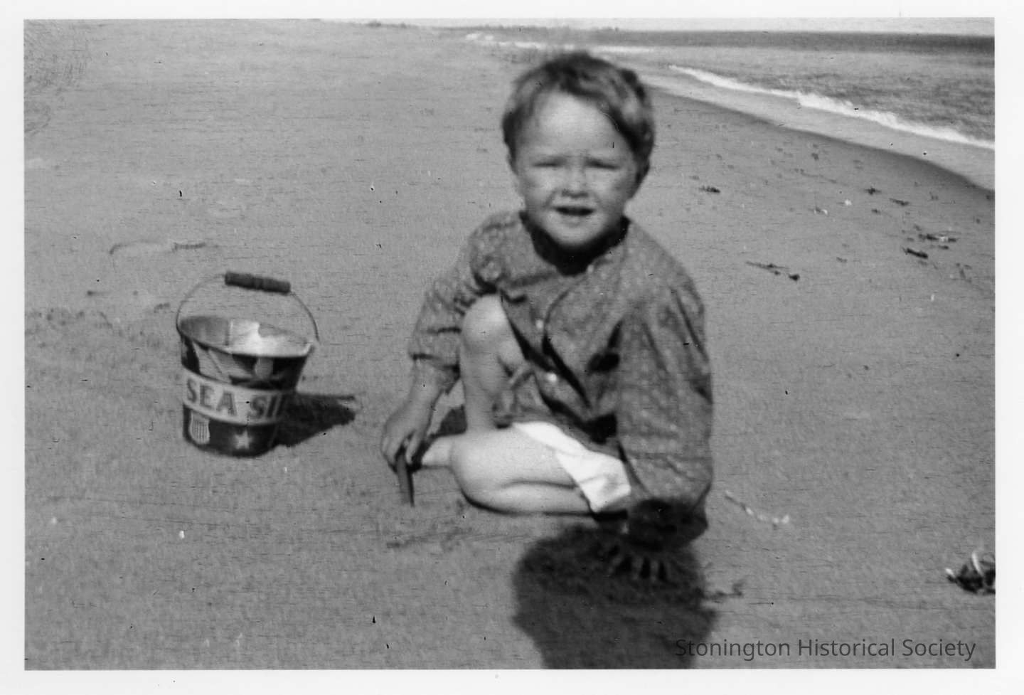 Robert P. Anderson playing on the beach. He has a small bucket beside him that reads "Sea Shells". Negative is included behind the picture.