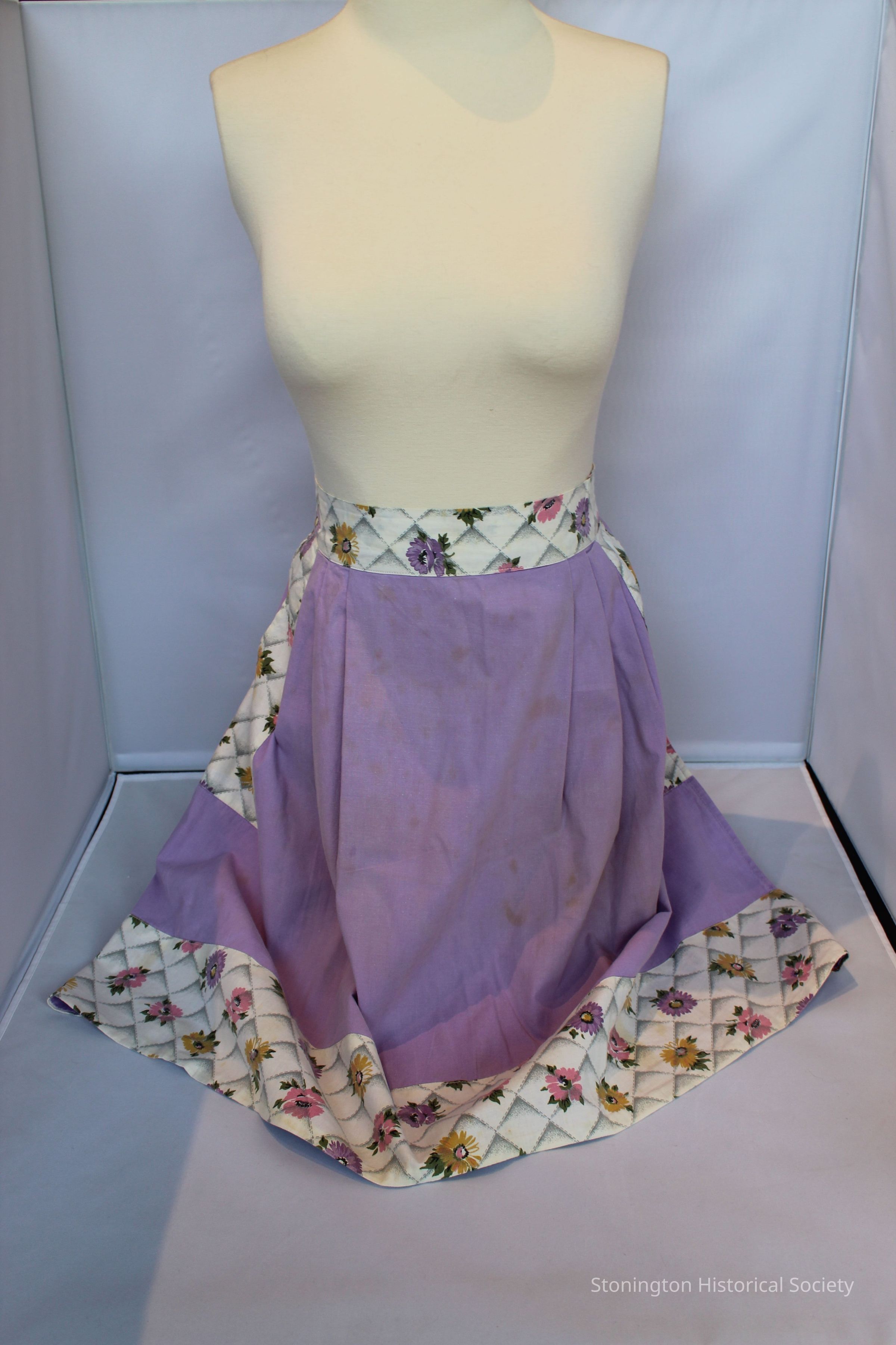 Purple and white floral waist apron. Two pockets on the front, ties at waist. Lightly stained on front. Made by Jerusha Anne Tucker Coon Woods in the early 20th century. Jerusha worked as a tailor, and also operated Birchwood Dairy on South Broad Street in Pawcatuck with her husband, Eugene M. Woods.Collection