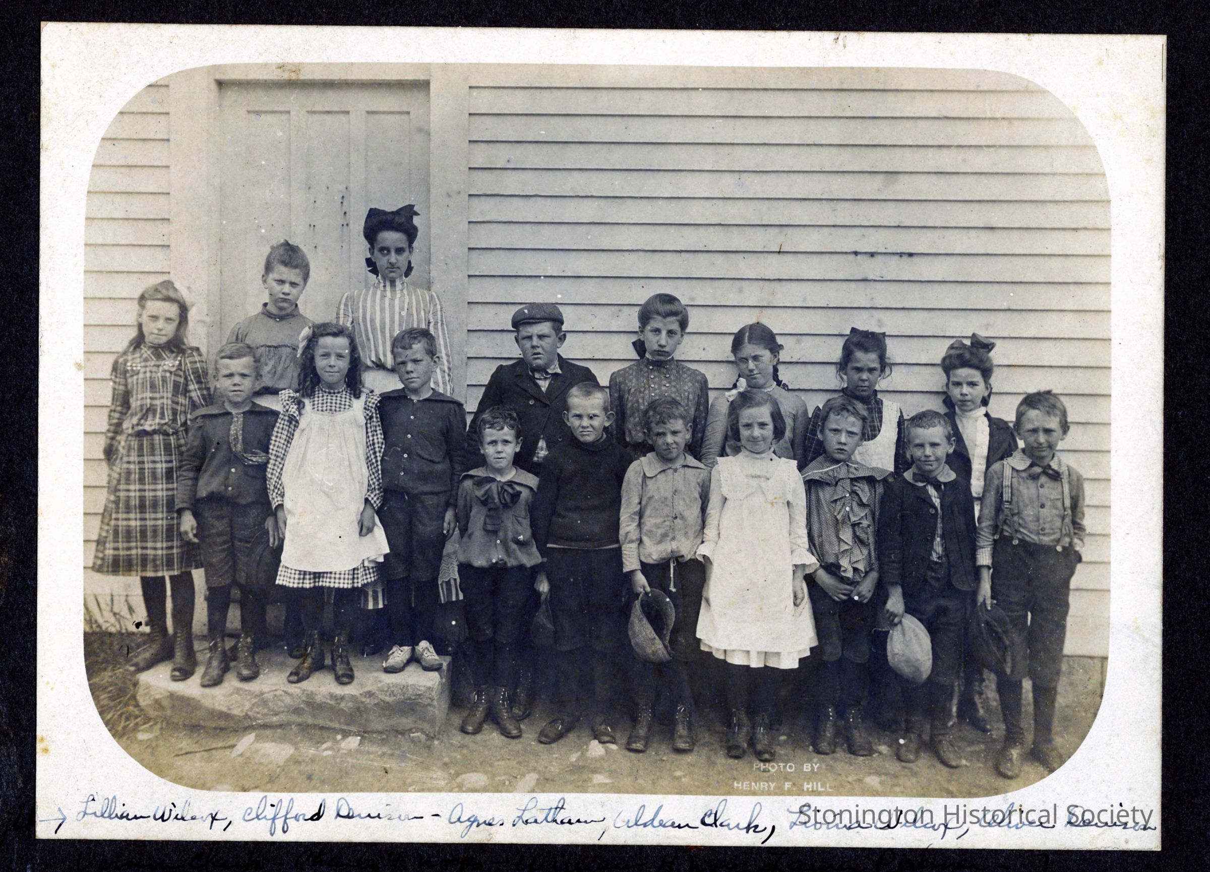 A black and white photograph of a group of school children standing outside the Quaimbaug Schoolhouse. Photograph was taken by Henry F. Hill of Stonington, probably around 1900. Some of the children are identified, and an accompanying map is included.
