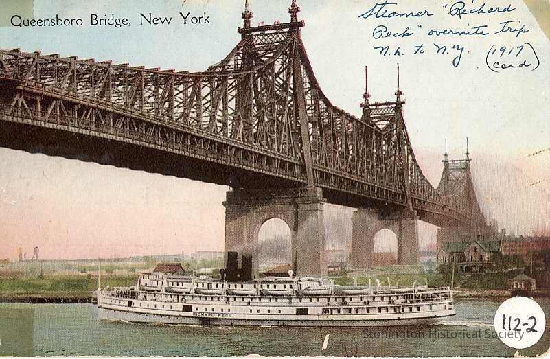 Steamer "Richard Peck" going under the Queensboro Bridge, NY. Note on front and back: Steamer Richard Peck overnight trip New London to New York. I traveled to New York in 1926 from New London with parents on "Richard Peck", Steamer. Oliver Burtch, Purser, of Stonington, Elizabeth Trumbull's relative"