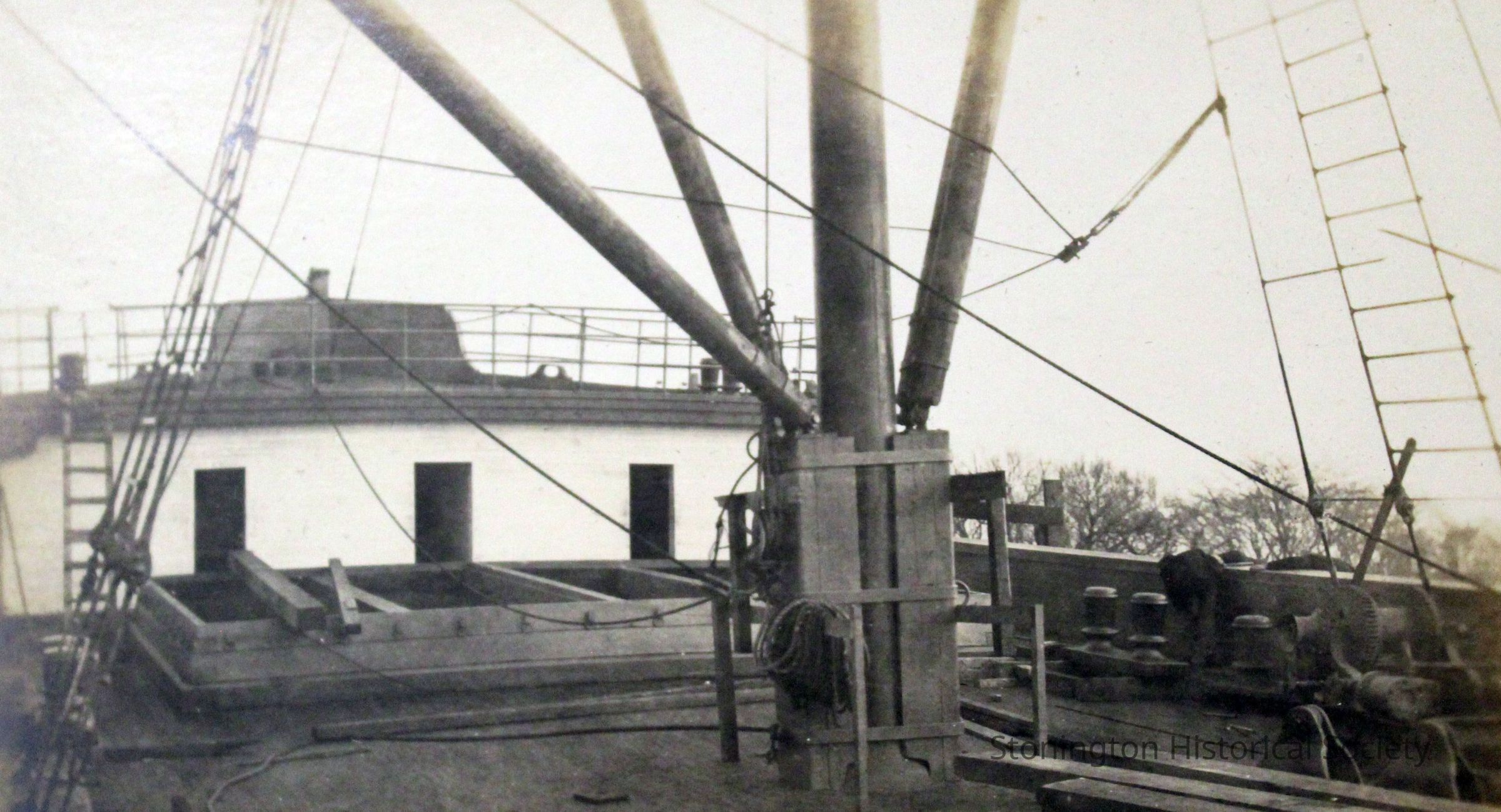 Hatch on the deck of the SS Lansing. This would have been near the end of the construction process, in the spring of 1919. The Lansing steamship was rebuilt by the Ship Construction and Trading Company, Inc. of Stonington for the Nafra Company of New York.Made/Created