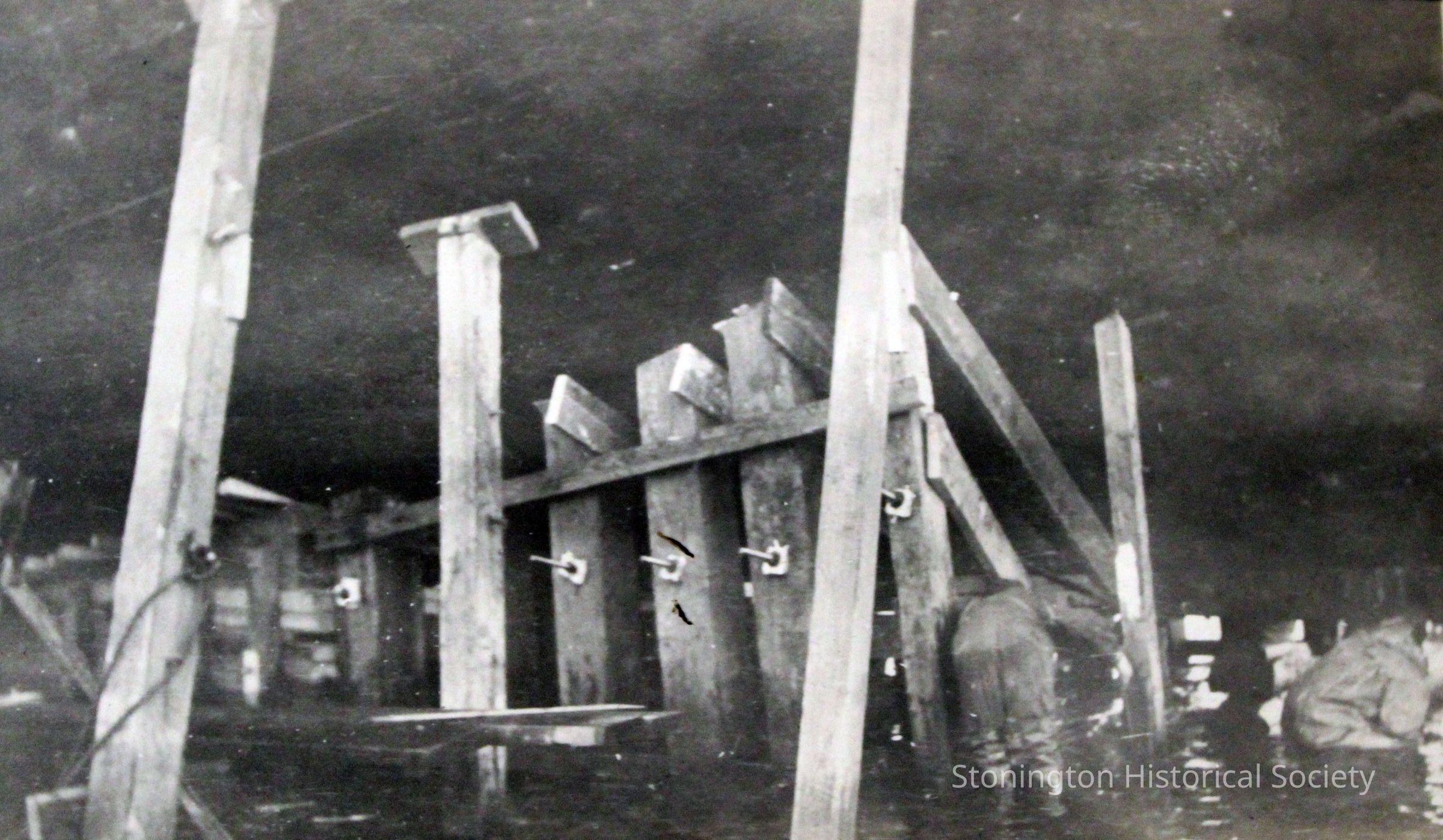A close up of the cradles and blocks beneath the SS Lansing at Stonington docks as it nears completion, spring 1919. The Lansing steamship was rebuilt by the Ship Construction and Trading Company, Inc. of Stonington for the Nafra Company of New York.Made/Created