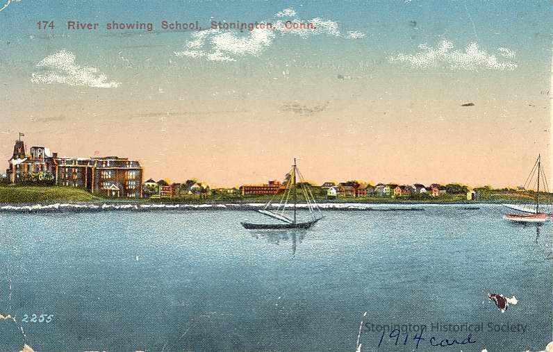 Postcard of River showing School from harbor, Stonington Conn. sent July 10, 1914 to Barbara Mueller at Camp Mashanatuck, Mystic