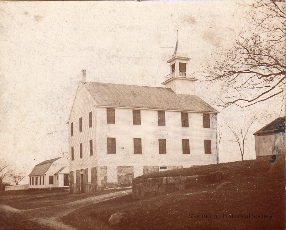 Black and white photograph of the Road Church from the photo collection of Henry R. Palmer, Jr. Handwritten on back: "First Congregational Church of Stonington. Organized 1674, celebrates its 225th anniversary June 3. Third oldest church in Southeastern Connecticut. Familiarly called the 'Road Church'."