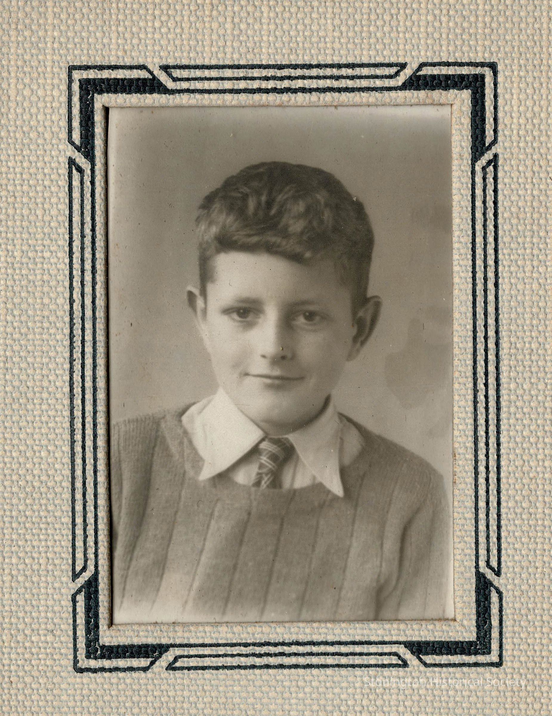 Photograph of Robert Meeker, as a young boy. He is wearing a sweater, collared shirt and tie. This photograph is in a cardboard frame.