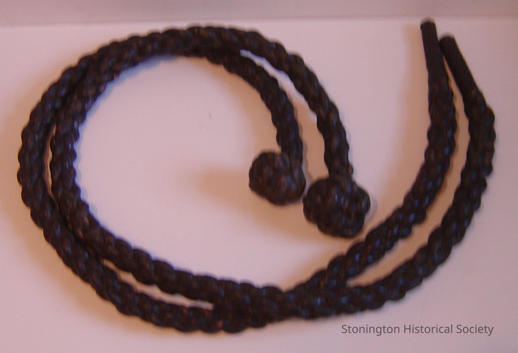 tarred rope, with "monkey fist" knots on one end and finer weaving on the other, possibly used as a boat railCollection