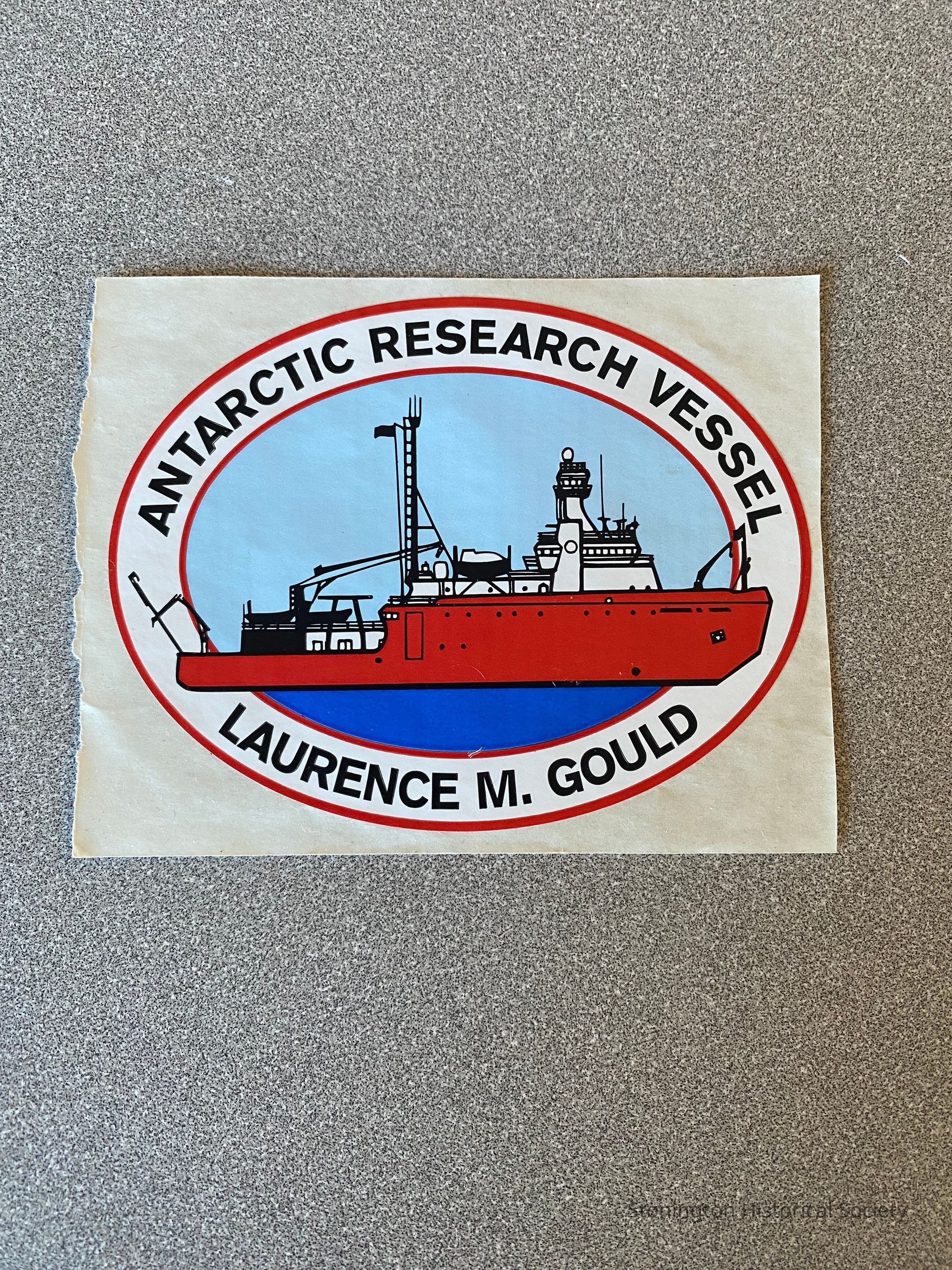 An oval sticker for the Antarctic Research Vessel Laurence M. Gould. The ice breaker and research vessel is named after Laurence McKinley Gould, an American scientist who had explored both the Artic and Antarctic. He was second in command of Admiral Richard E. Byrd's first expedition to Antarctica from 1928-1930. Gould died in 1995 at the age of 98, and the same year the National Science Foundation initiated the charter for the services of this ice-strengthened vessel to further its studies and knowledge of the Antarctic peninsula and southern ocean.