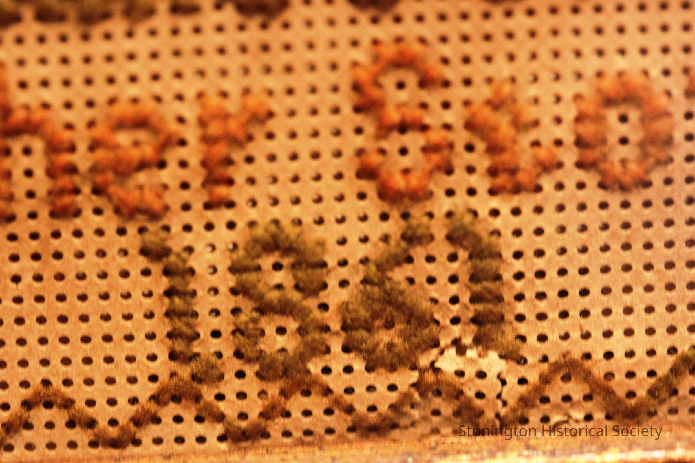 A framed sampler with numbers 0-13, cursive and print alphabets in upper and lower case. The bottom reads "Nathaniel Palmer Stantons sampler wrought at Miss Sheffield School for his dear mother Stonington Apr 26th 1861." It is sewn in colors of red, green and gray (blue)