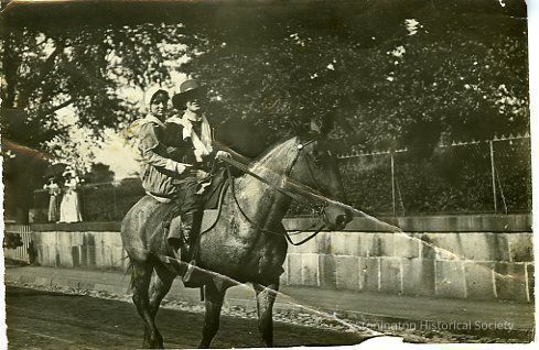 Jesse B. Stinson as Samuel L. Chesebro and Elizabeth Wilbur as Priscilla Alden on horseback (she is riding sidesaddle). Chain link fence in background. This is on Water Street entering the borough going towards the Point next to the Loper mansion which later became the Post Office site.