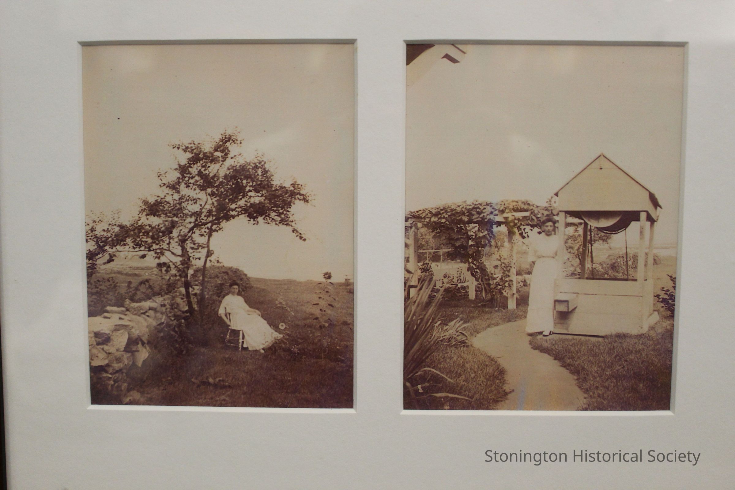 Sarah Winifred "Winnie" Kendall Odell in her garden at 13 Main Street in Stonington Borough. She was the wife of Joseph Odell. Photographs are matted and framed together.Collection