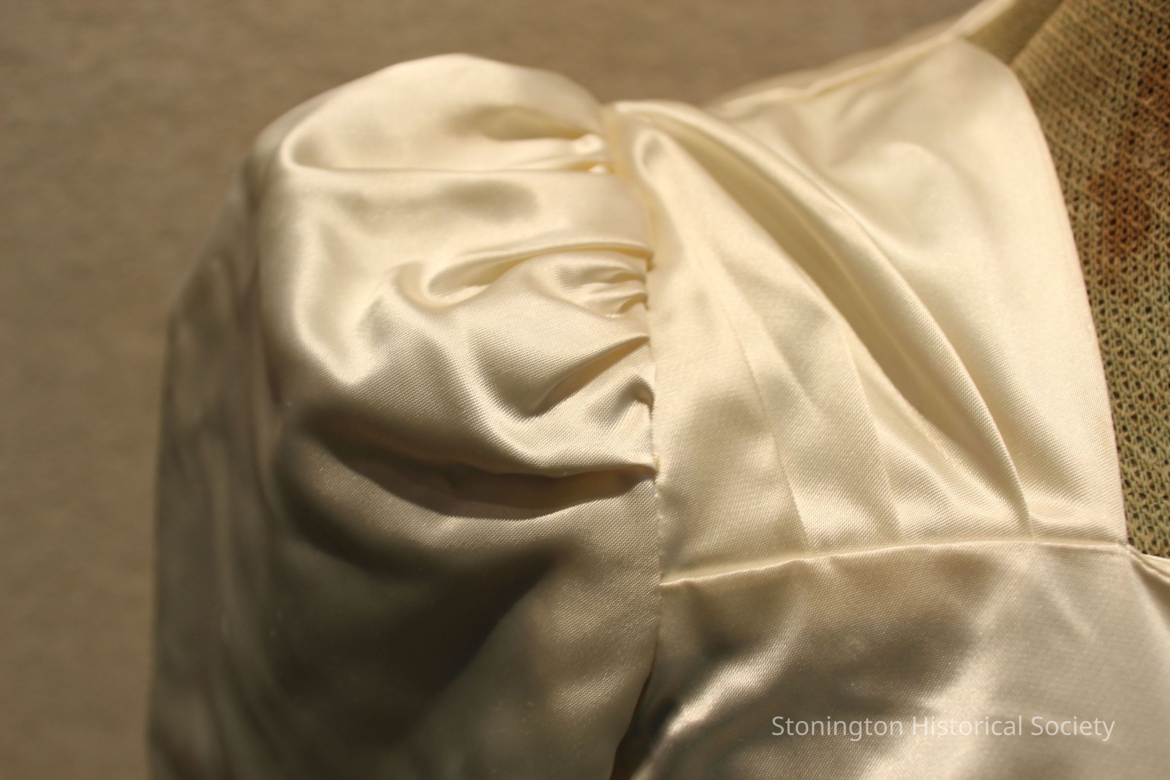 Satin en train wedding gown, with a sweetheart neckline and long sleeves. Satin covered button closure at back, and sleeve edges. No tag, so was most likely made by the Bride's mother, or other local seamstress. Belonged to Philomena M. DeSimone, who married Eugene H. McShane on October 9, 1945.Collection