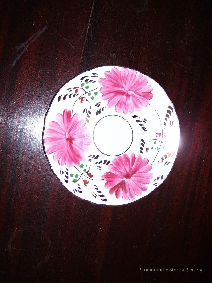 White saucer with three large, hand painted pink chrysanthemums. In between the flowers are small red flowers with green dots (leaves?) as well as dark red luster accents. The bottom of the saucer is stamped "Allertons est 1831 Made in England." Imprinted on the bottom is 7/40.Collection