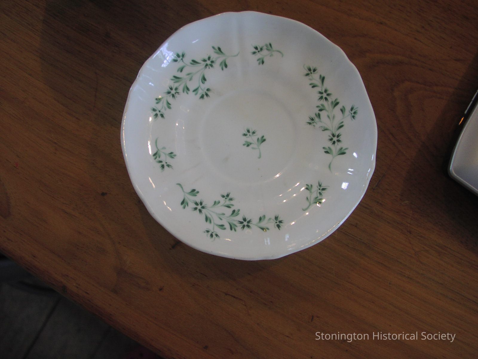Saucer, one of two Part of eleven piece set; white with green sprigs, called "spriggled" by Betsey Denison, original owner.Collection