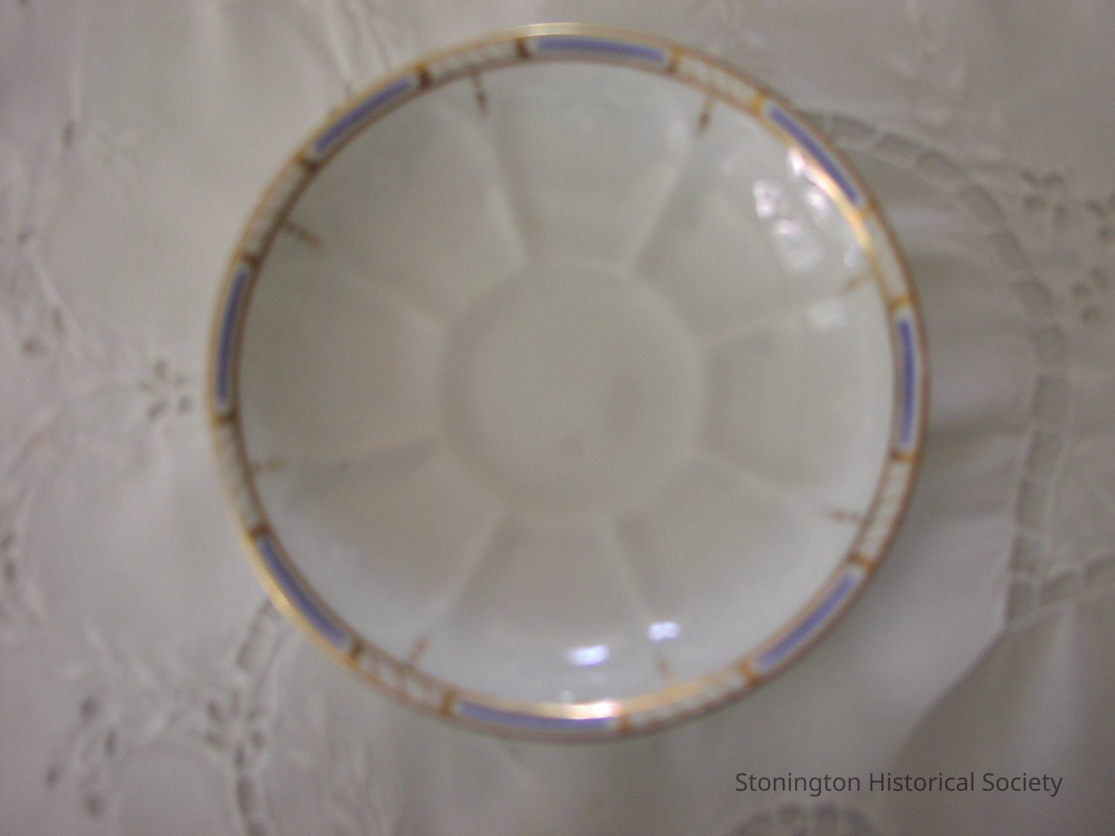 White saucer with a design of gold luster stripes that run the perimeter with shorter blue stripes in between.