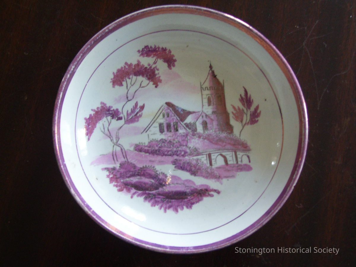 Pink lusterware saucer with a scene of a castle in front of a bridge. The saucer is relatively large.