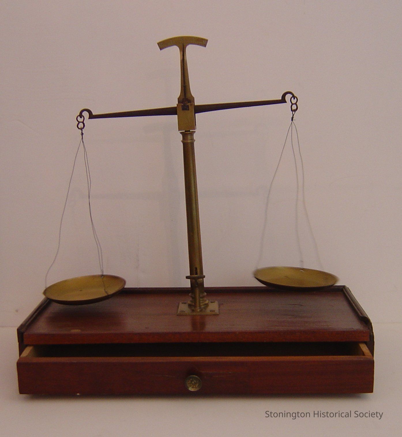 scale, wood and brass, drawer w/weights, apothecary balance once belonging to Dr. Hyde.