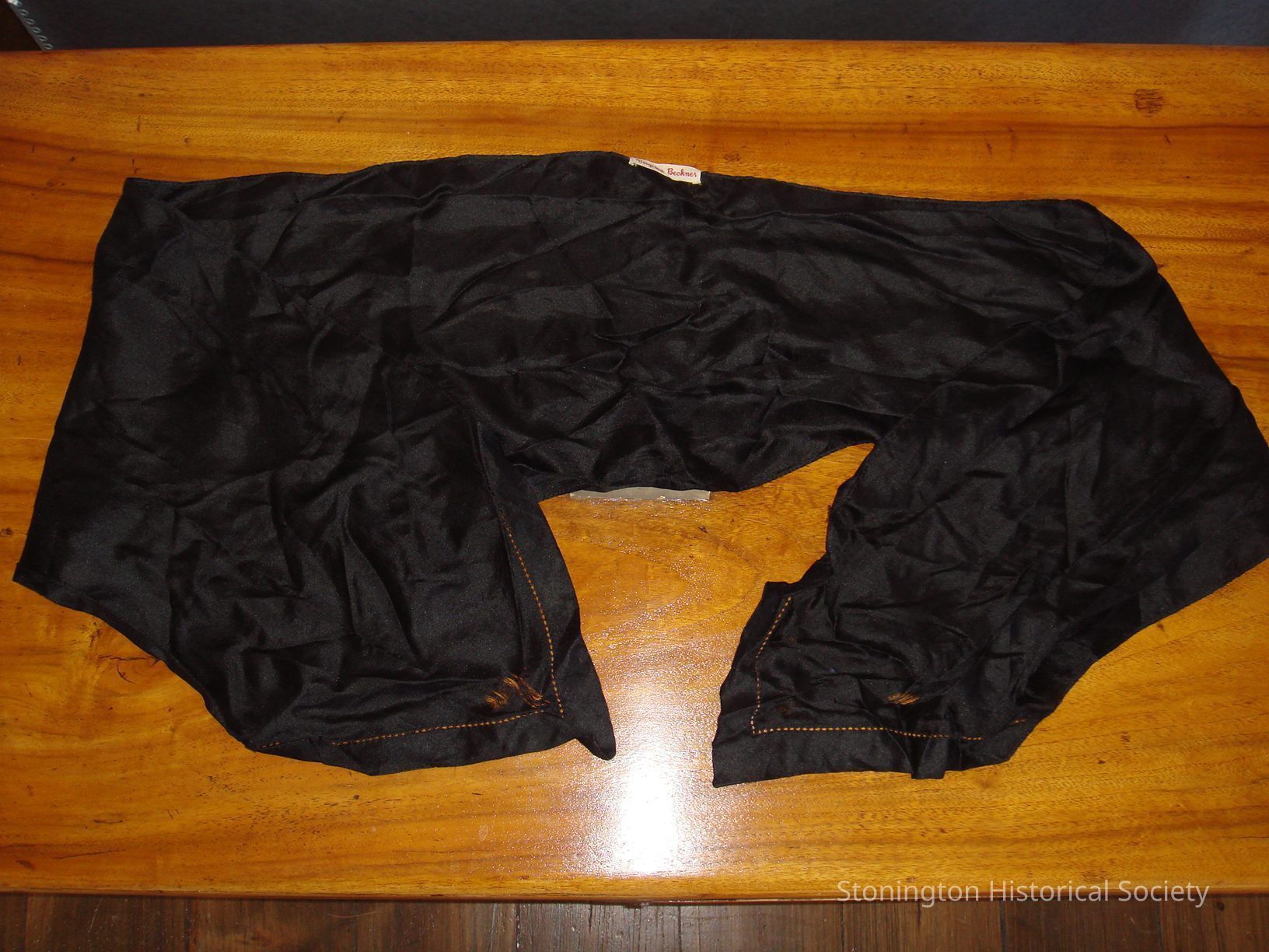 ladies black silk scarf cutwork at pointed ends cloth label with red machine script: Virginia Beckner