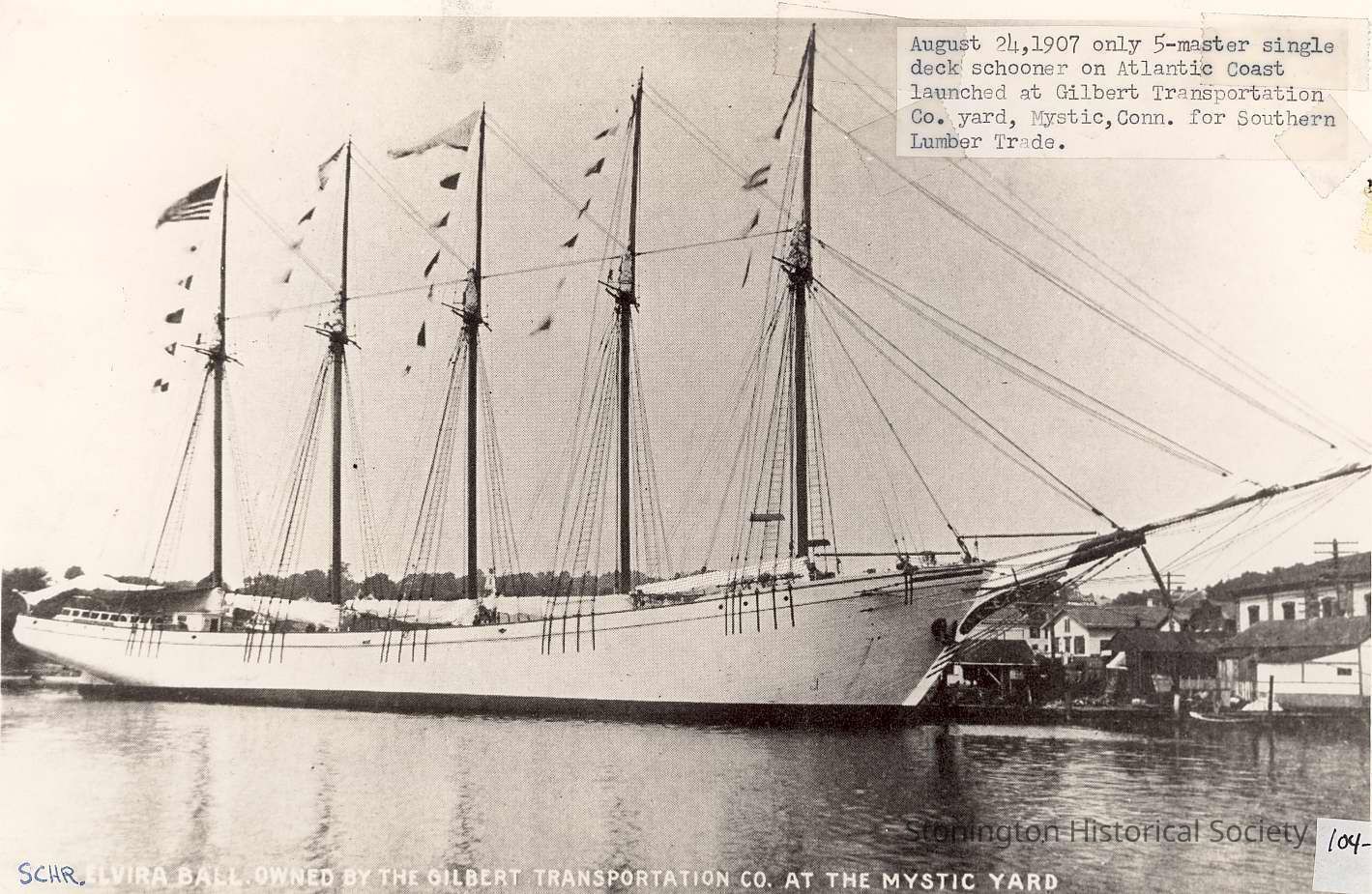 Notes: August 24, 1907 only 5-master single deck schooner on Atlantic Coast launched at Gilbert Transportation Co. yard, Mystic CT for Southern Lumber Trade.
