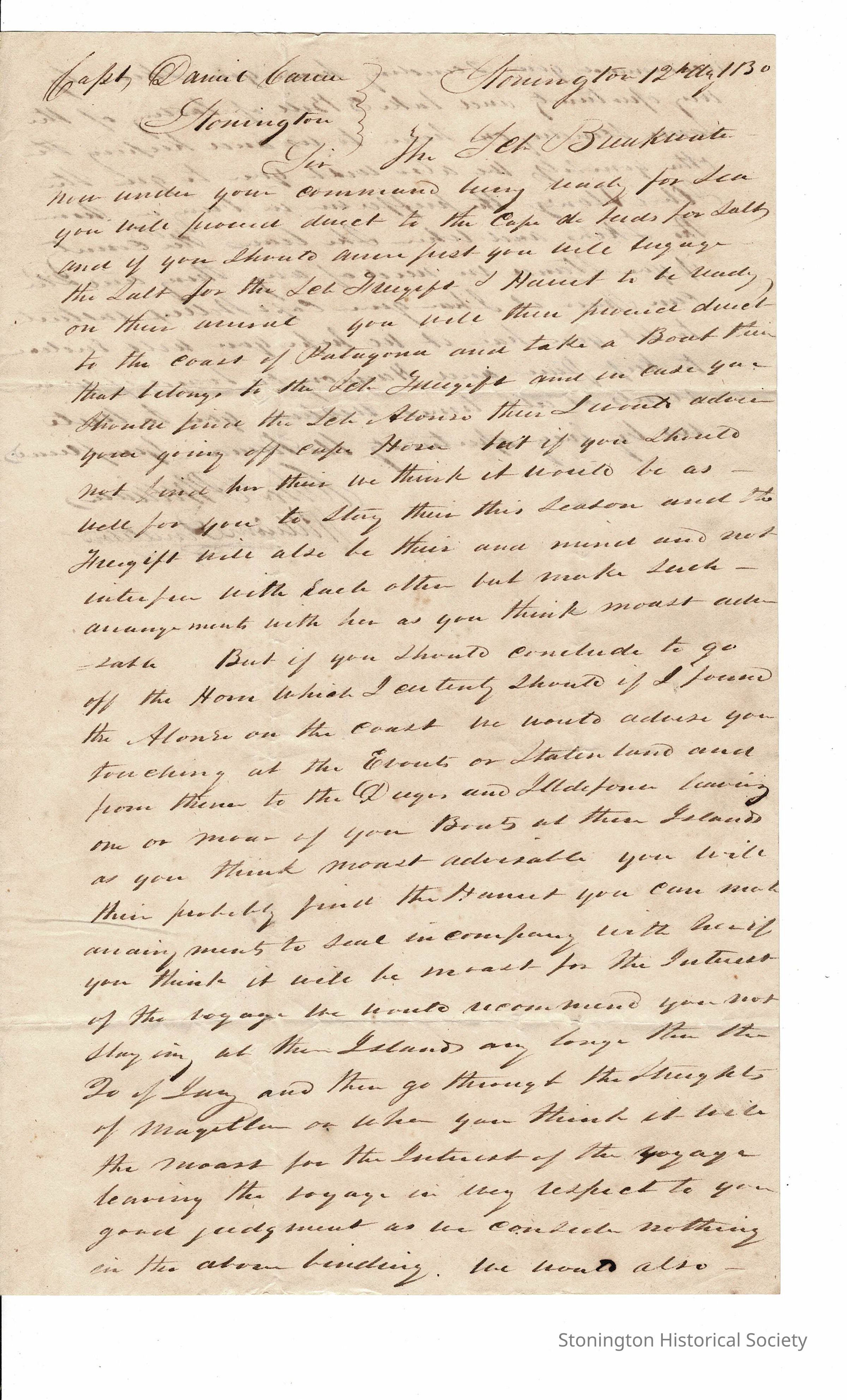 1. Letter from Charles Williams and William Pendleton to Capt. Daniel Carew, Master of the Schooner "Breakwater", August 12, 1831, advising him on ways to travel boats to look out for.