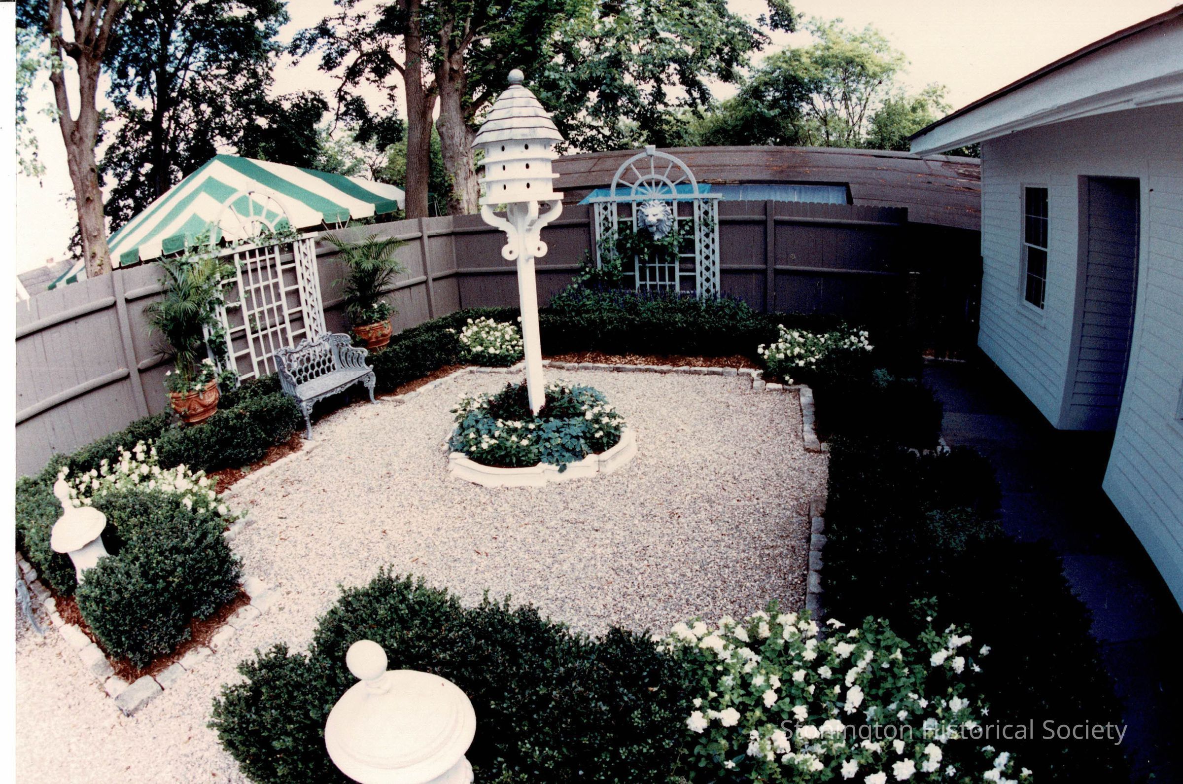 View of “flower parterre” in the Palmer House service yard, as it was for the Designer’s Show House in 1989.Designed by R.J. Vickers for the Herbery at Rattleberry Farm, Hadlyme, CT. The roof of the chicken coop or garage is visible behind the lion trellis.Collection