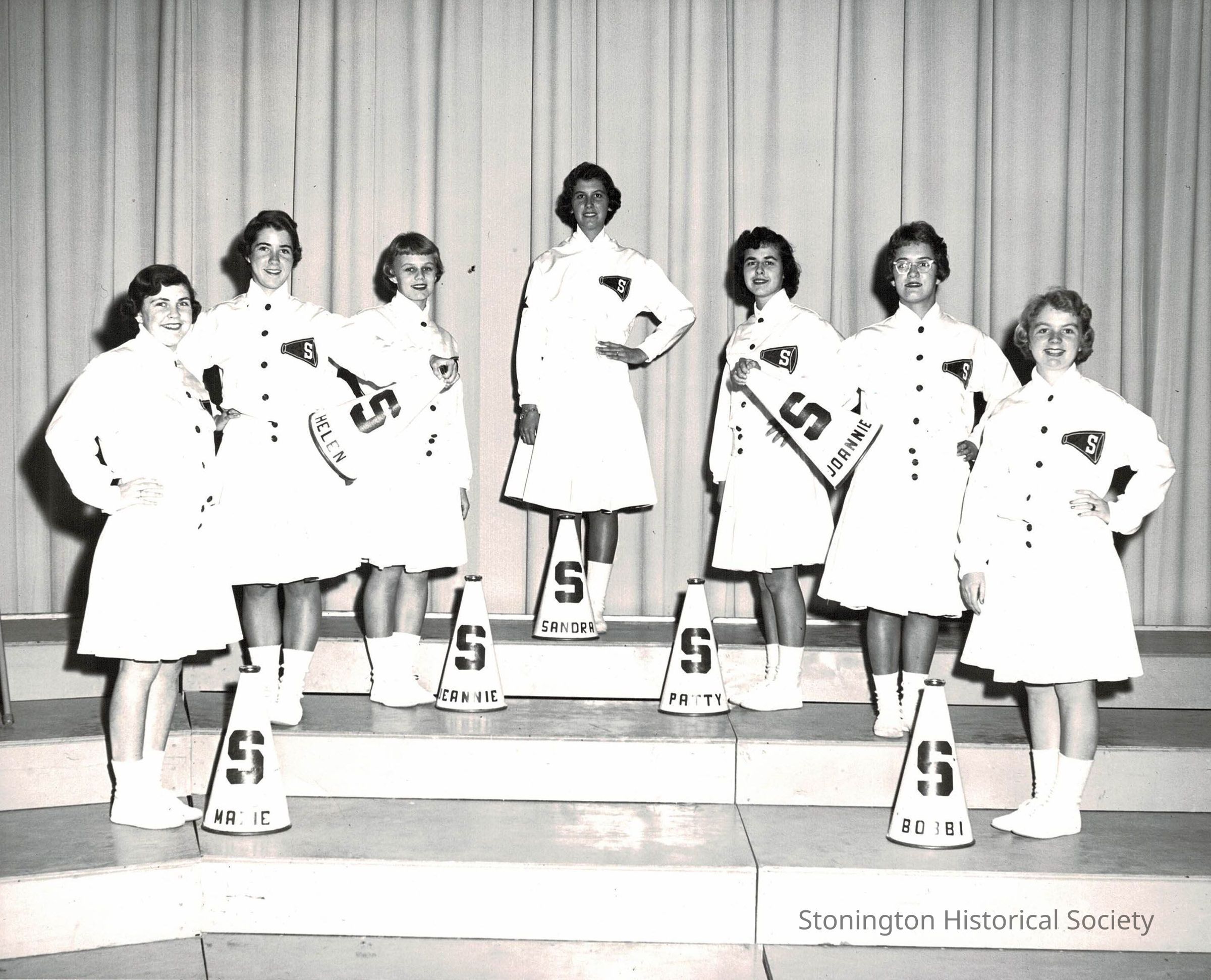 Black and white photograph of the senior cheerleaders, Stonington High School class of 1958. From left to right, married names are in parentheses: Mazie Shea (Boucher), Helen Cassell (Cowell) , Jean Wilkinson, Captain Sandra Pignataro (de Porry), Patricia Planchon (Whipple), Joan Miller, Barbara Stowell (Higgins).