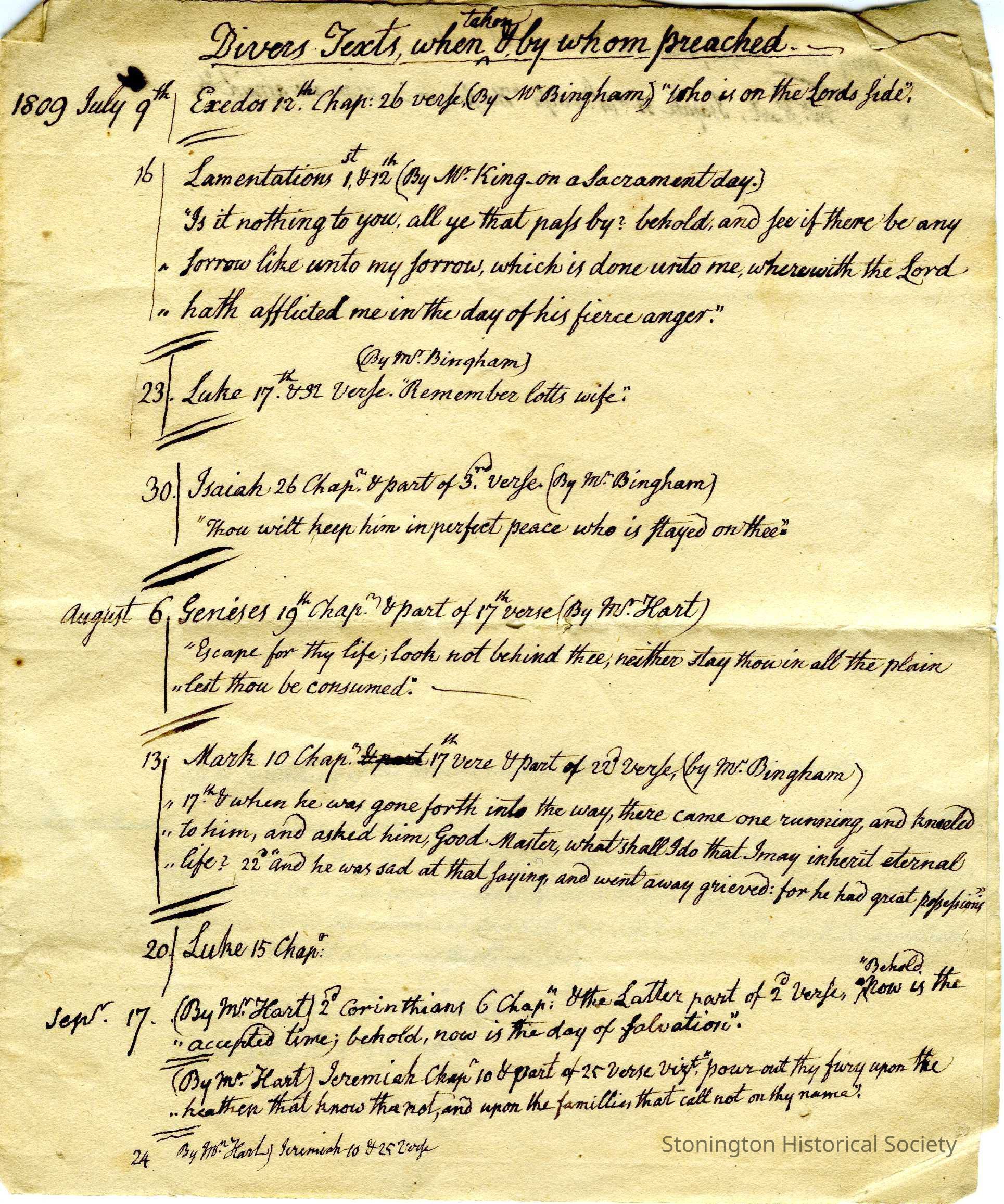 "Diverse Texts, when taken and by whom preached" July 9 - October 1, 1809. Most sermons given by Rev. Ira Hart, pastor of First Congregational Church of StoningtonCollection