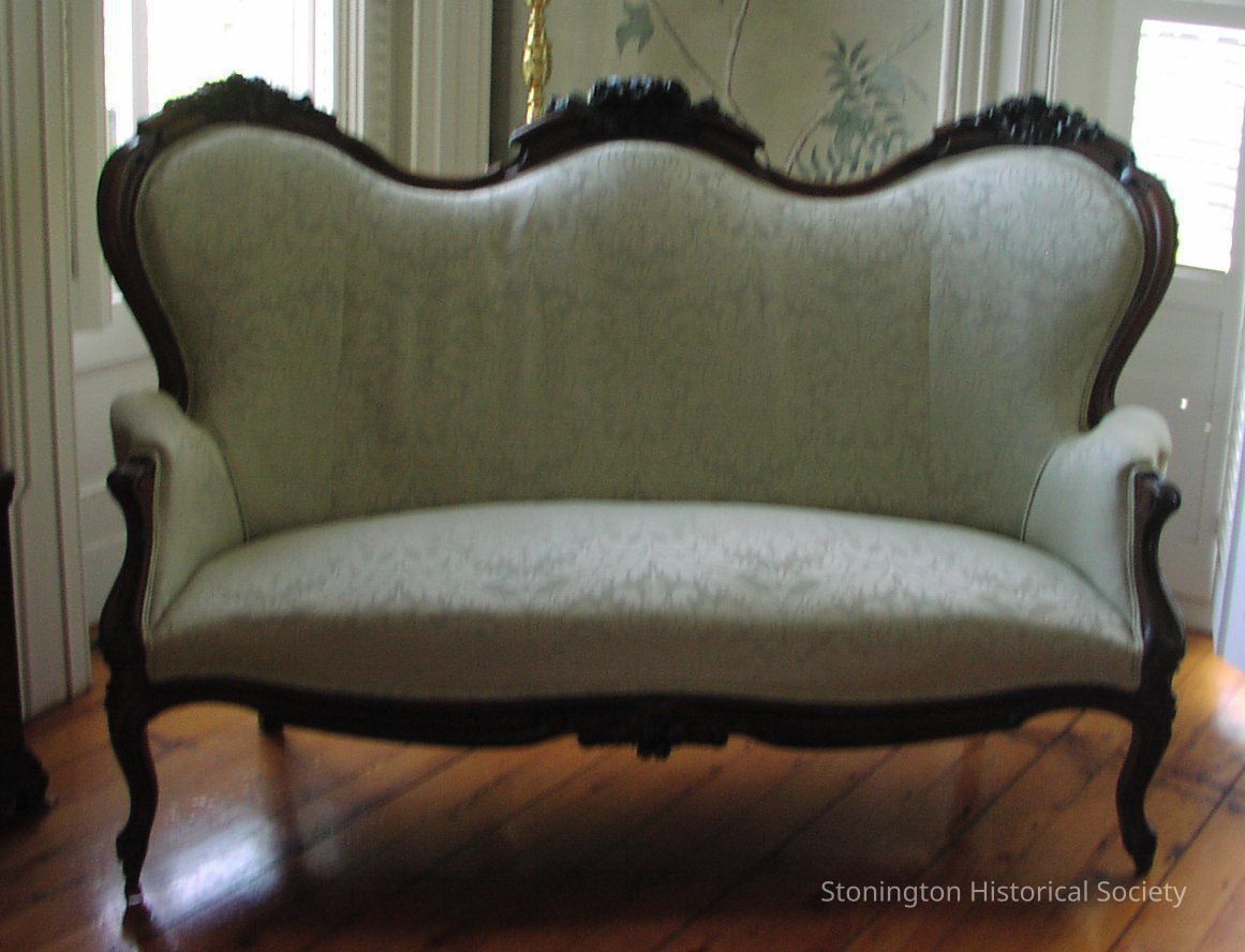 Rococo-revival style settee with serpentine back, short cabriole legs; upholstered in faded mint green damask, floral carving on front bottom and top of back at high points-sides, middle.Collection