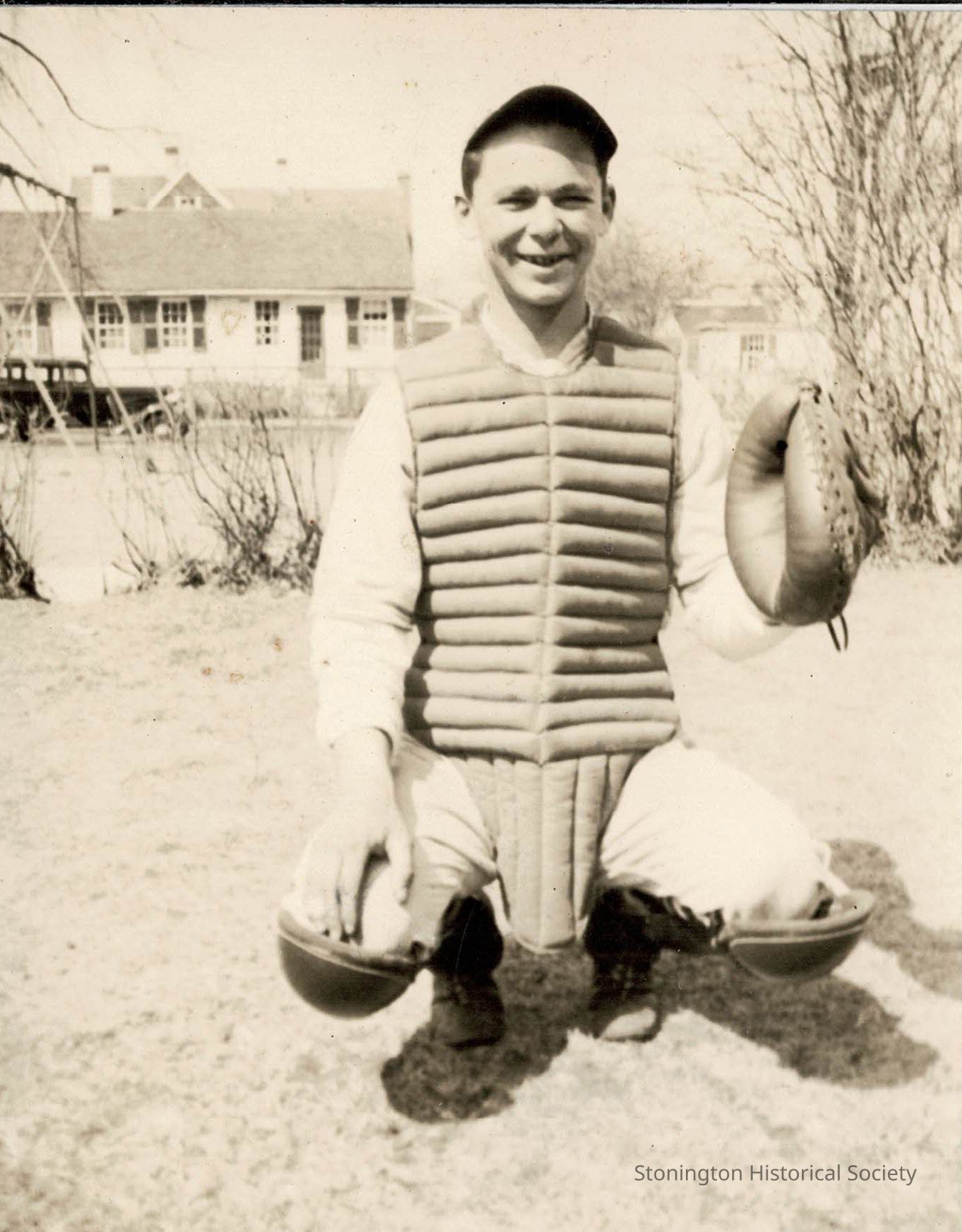 Black and white photograph of an unidentified catcher of the Borough School baseball team, undated. This could be a photograph of Joseph "Sharkey" Fretard (identified using the 1937 Stonington High School yearbook).Collection