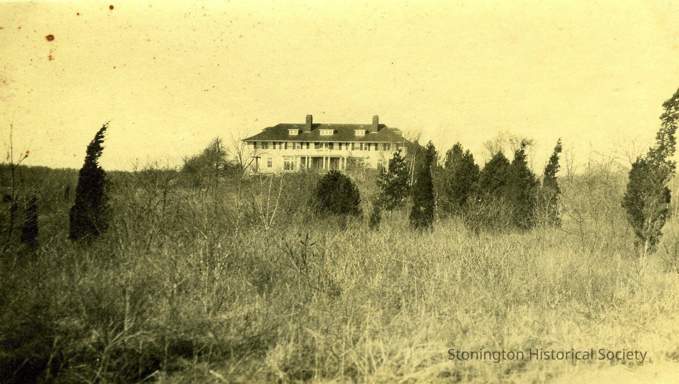 black and white photograph of the Shawondasee Estate, a summer residence built by sisters Margaret and Mary Dreier off Flanders Road in Stonington in 1904.Collection