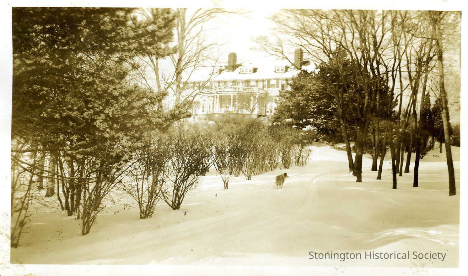 black and white photograph of the Shawondasee Estate, a summer residence built by sisters Margaret and Mary Dreier off Flanders Road in Stonington in 1904.Collection