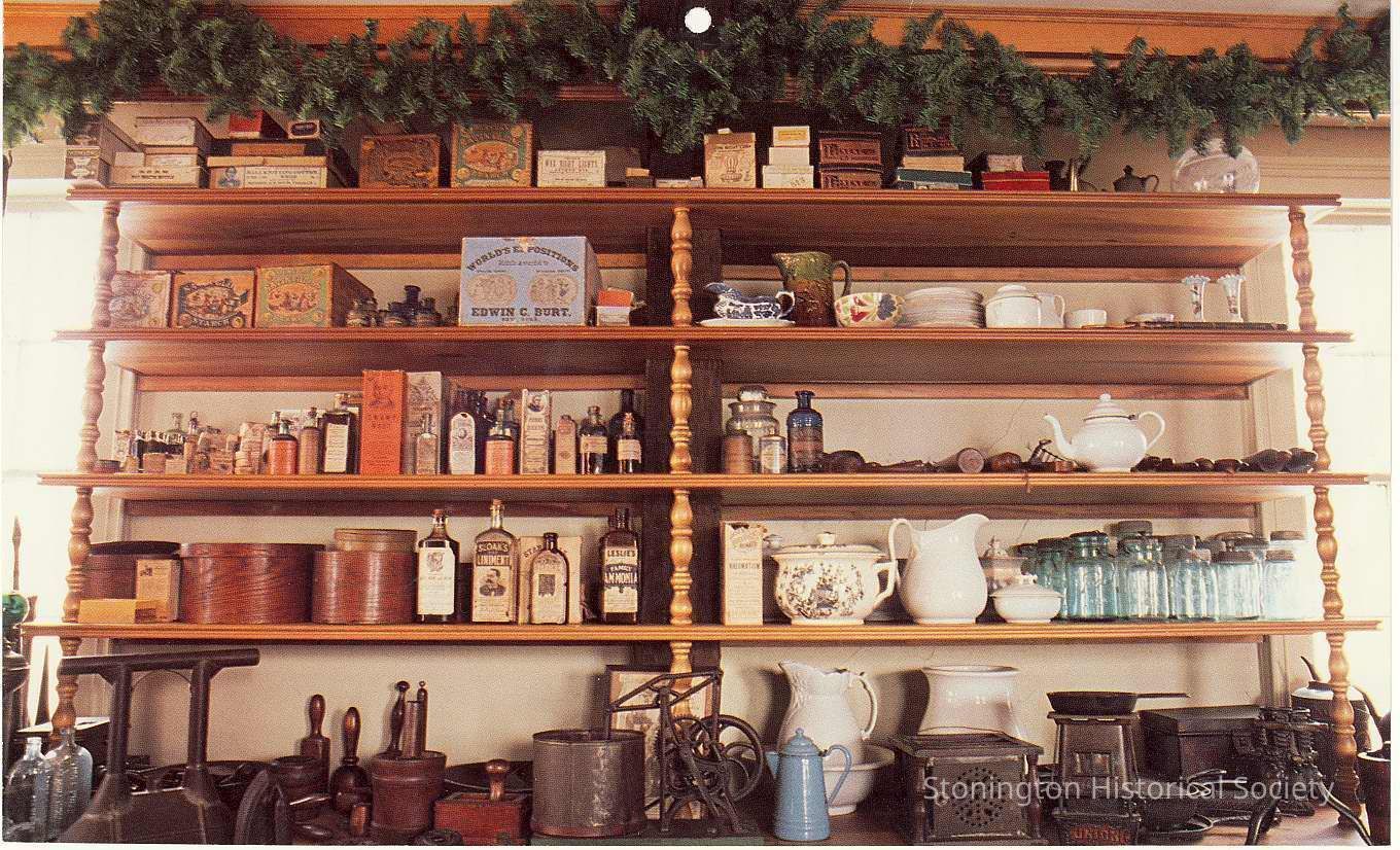 Shelf in Country store at Mystic Seaport from Chelsea Groton Savings Bank calendar, 1991.